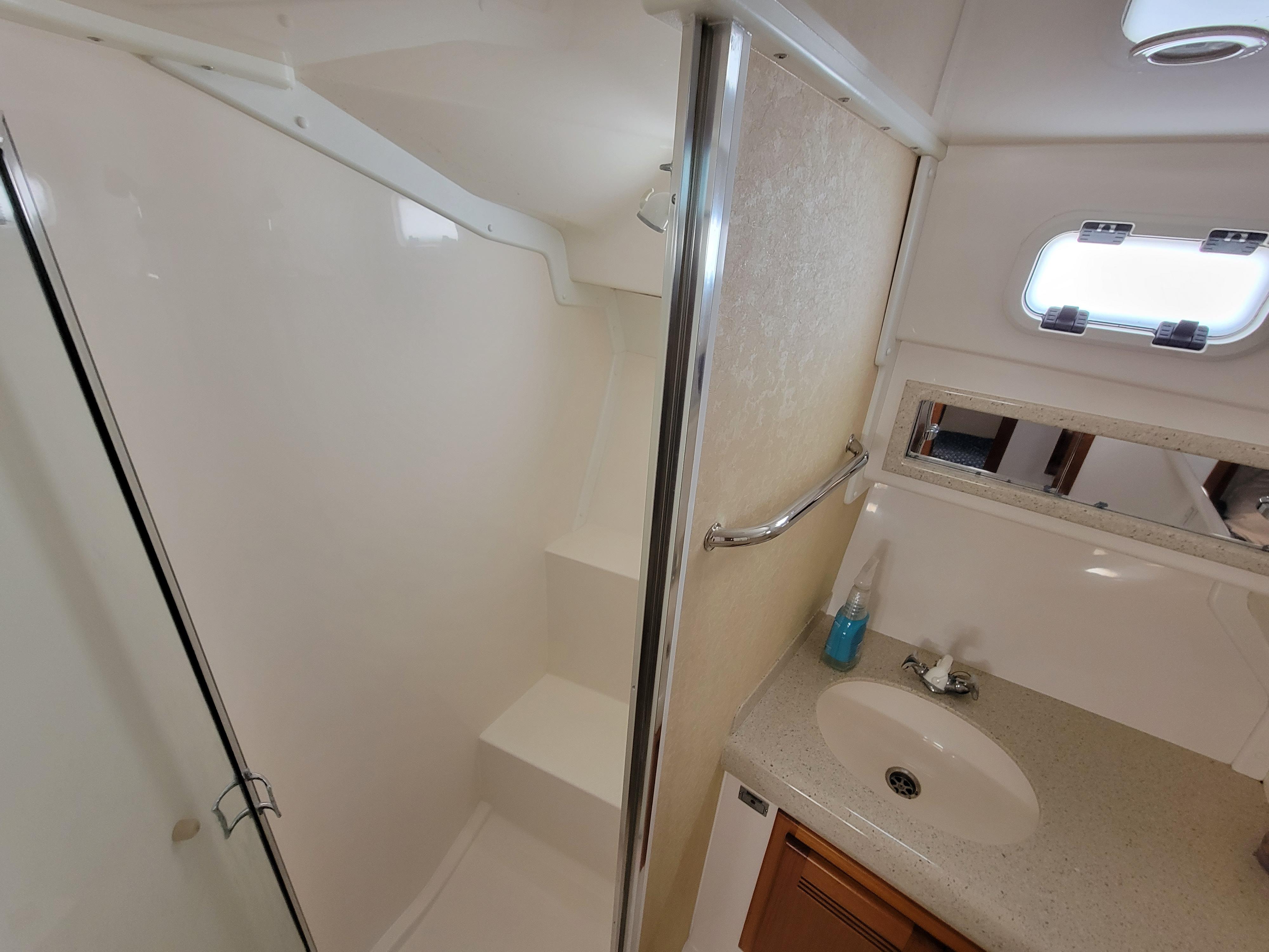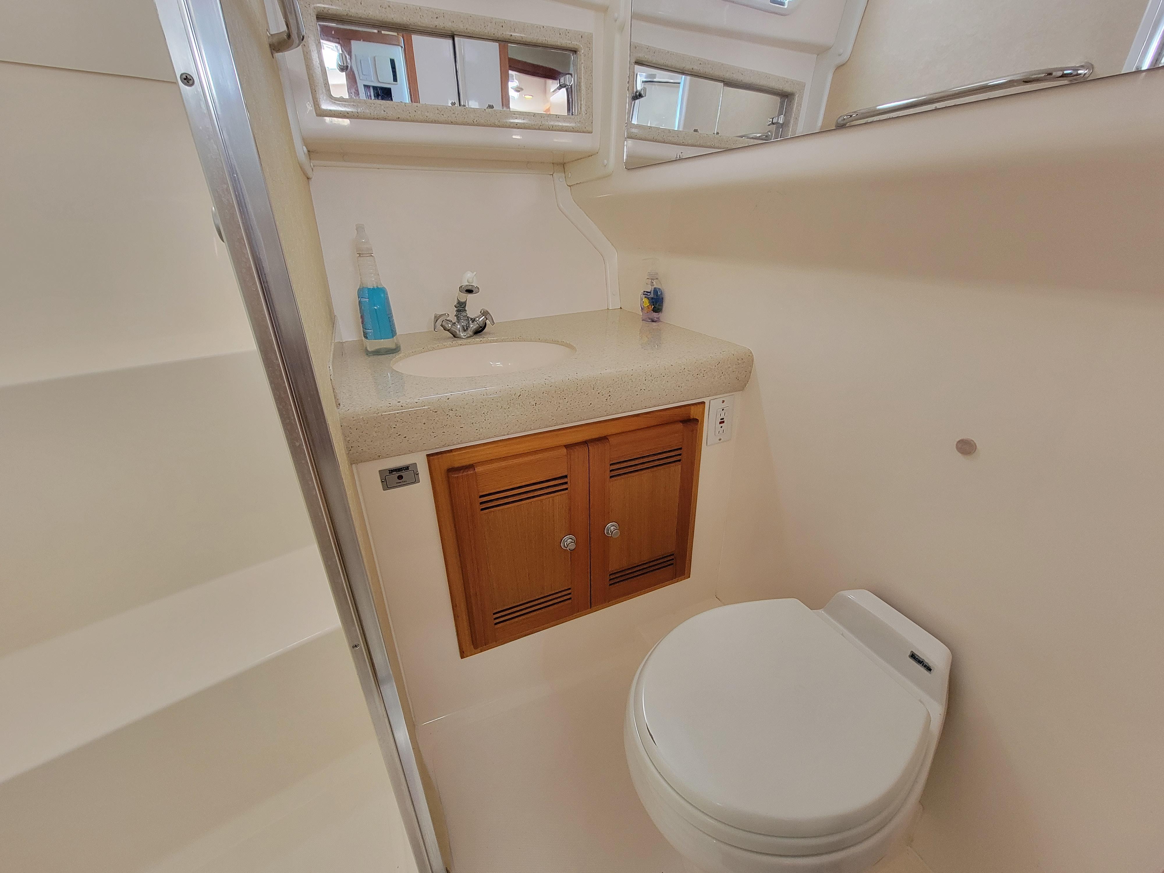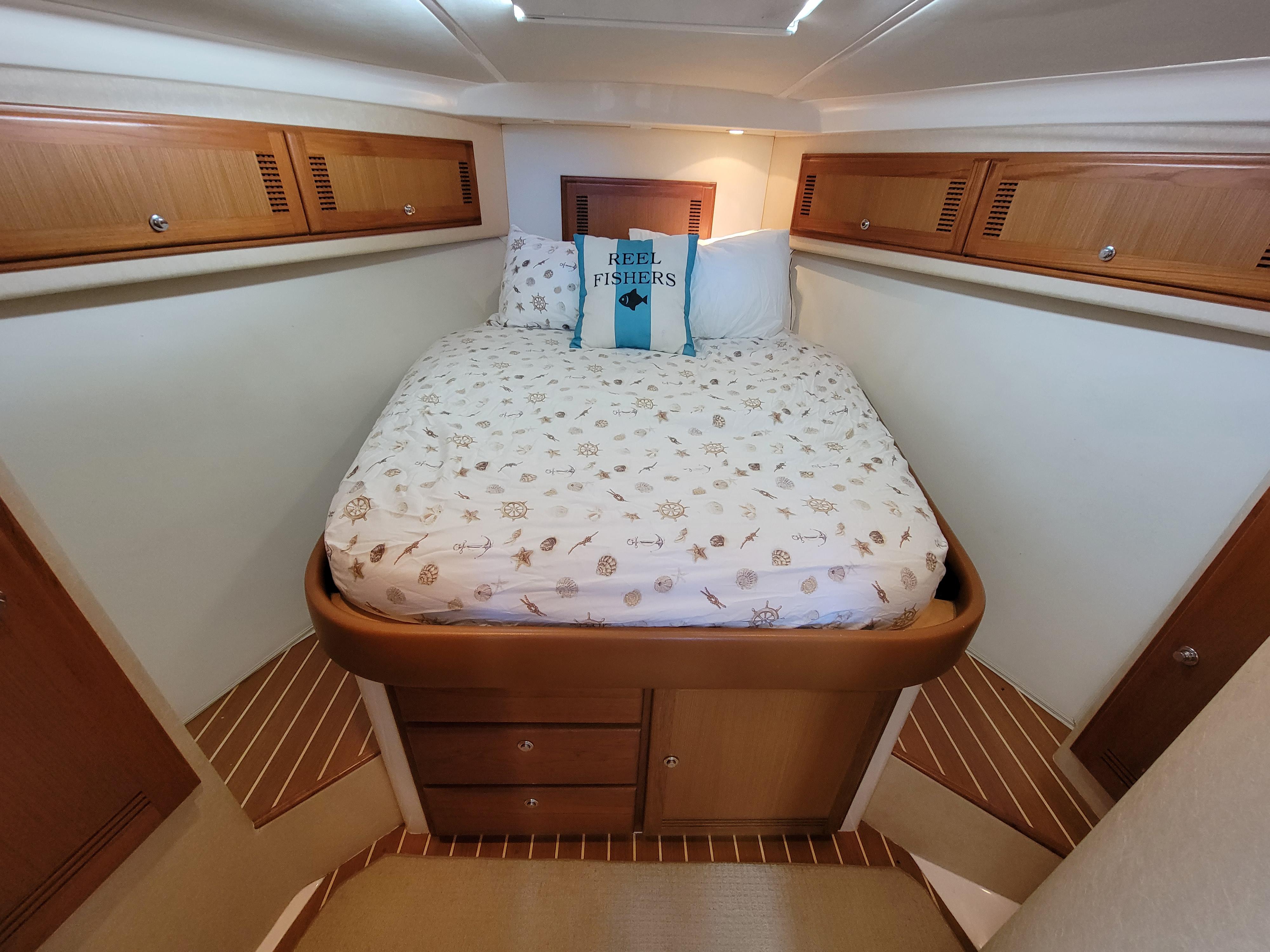 The Cabo 35 Flybridge Sportfisher is built by one the most successful boat builders in the business. Knowledgeable boat owners, fishermen, and the American financial community all consider the founders of Cabo Yachts to be two of the most successful builders in the world. Henry Mohrschladt and Michael Howarth began their first successful partnership building Pacific Seacraft sailboats. Back then, a serious offshore sailor planning an epic journey always chose (or aspired to) one of these boats. When Mohrschladt and Howarth sold the sailboat company, they decided they really wanted to build sportfishing boats. The result is what is seen here: the Cabo 35 Flybridge. Saltwater Sportsman claims that "the Cabo 35 lays down one of the cleanest wakes I've seen. With minimal turbulence behind the twin props, the surface trolling lures run exceptionally well from 1,000 rpm (10 mph) all the way up to 1,500 rpm (16 mph)." A 130-square-foot cockpit is unheard of on a 35-footer. Twin tackle boxes on each side of the cabin door carry everything to rig for any species that might be encountered. An industrial-strength transom door allows even the largest fish to be easily brought aboard and smaller fish can be safely stored in two large in-deck fish boxes. Everything else a serious angler demands can be found within easy reach, from rod holders to fresh- and saltwater washdowns. In fact, Cabo is so serious about this boat's fishing ability, that Henry Mohrschladt designed the cockpit before anything else, then built a boat around it. The flybridge with the aft-situated controls allows the helmsman an unobstructed view of the entire cockpit. When the fish moves off the corner, the Cabo 35 will beat it to wherever it's headed. The main cabin provides loads of room for socializing in elegant comfort. A portside galley affords plenty of room for the chef to create multi-course masterpieces, uncrowded by the guests at the starboard settee that easily seats five. There's additional seating portside aft of the galley. At the same time, there's precious little dead space, because storage abounds beneath settees and behind bulkheads. Below, a spacious double cabin features a large, double island berth on centerline and again, storage that puts many larger boats to shame. Two rod lockers forward conceal as many as 10 offshore rods with reels. A spacious head with a separate stall shower adjoins the forward stateroom.