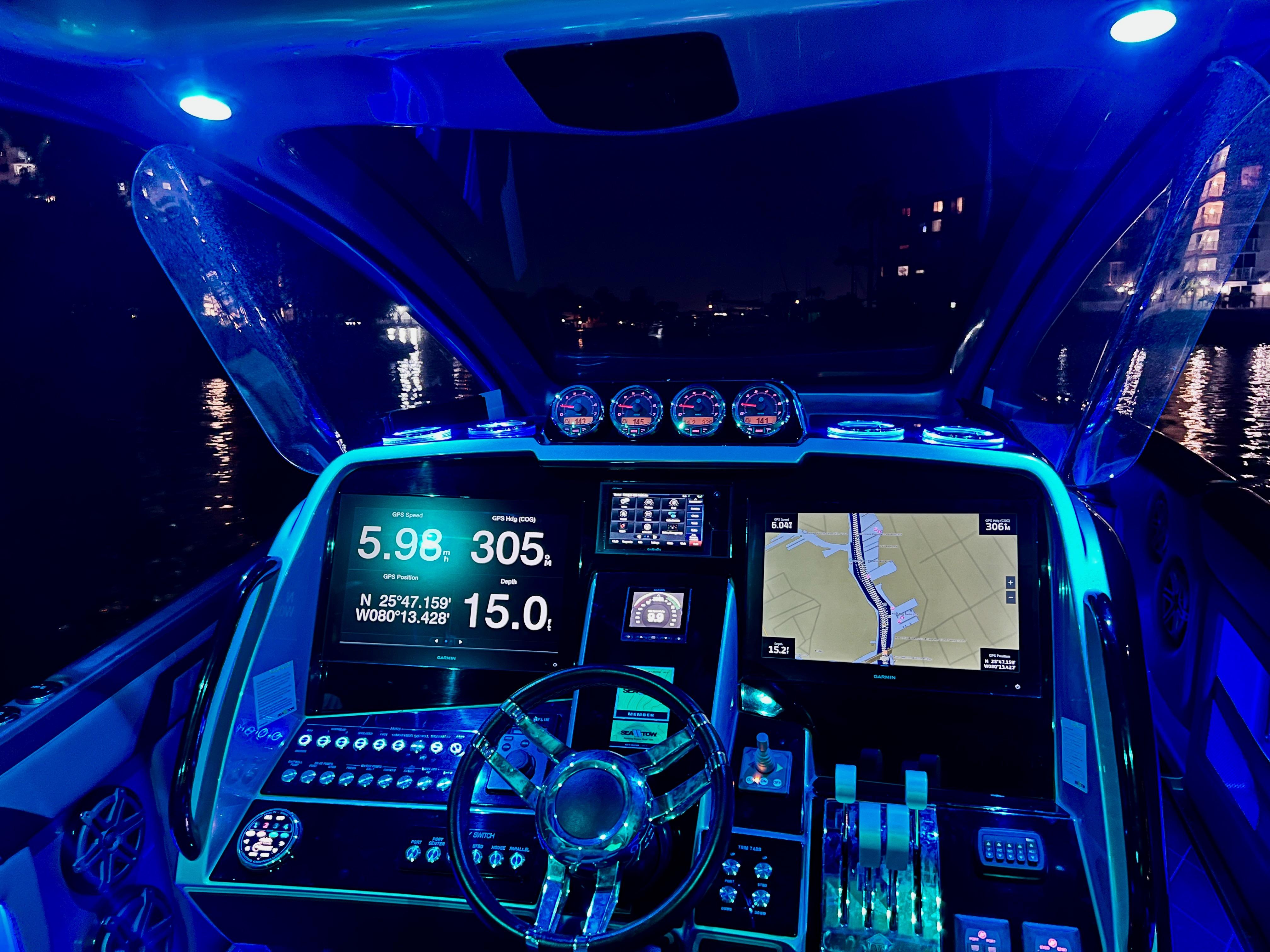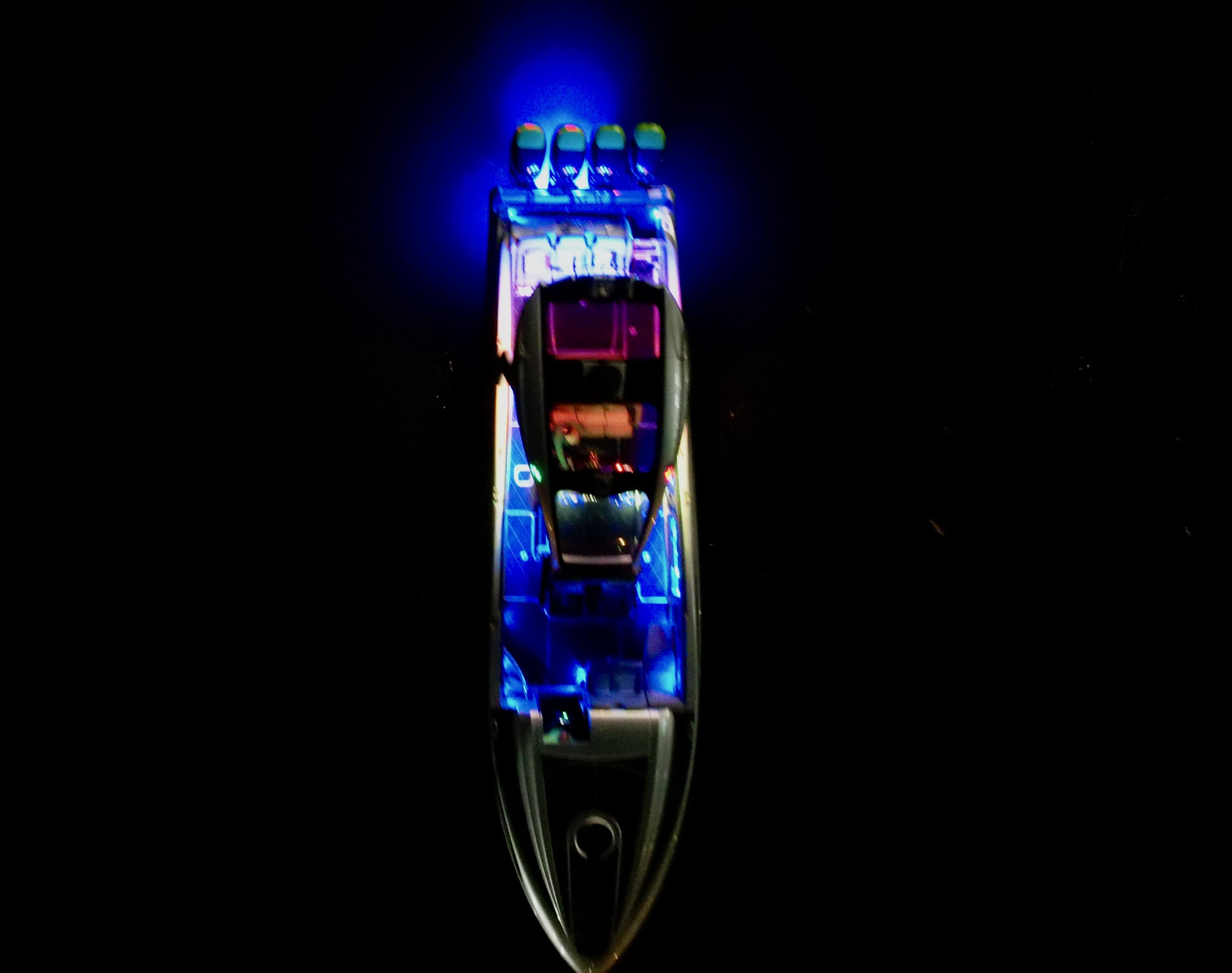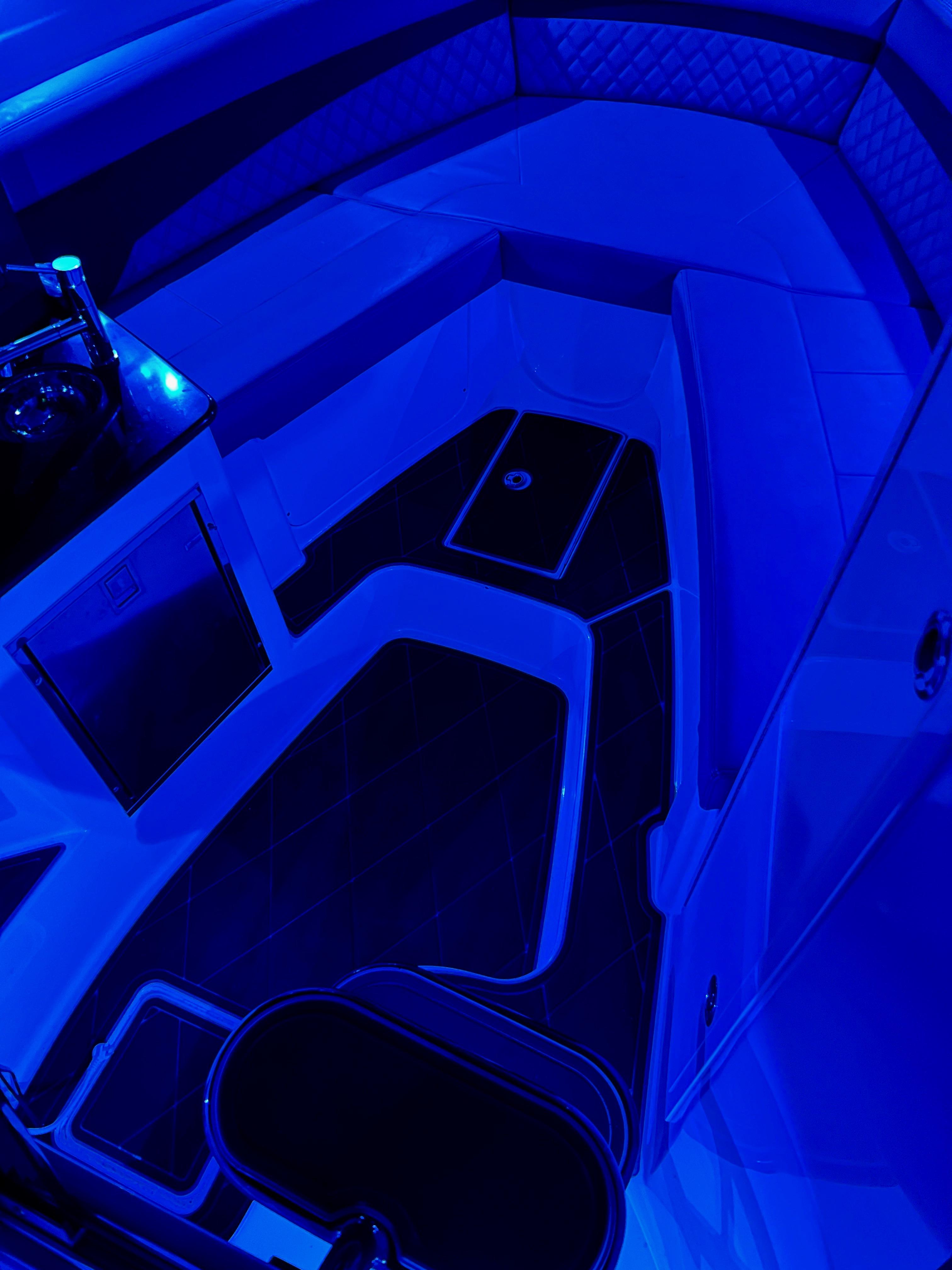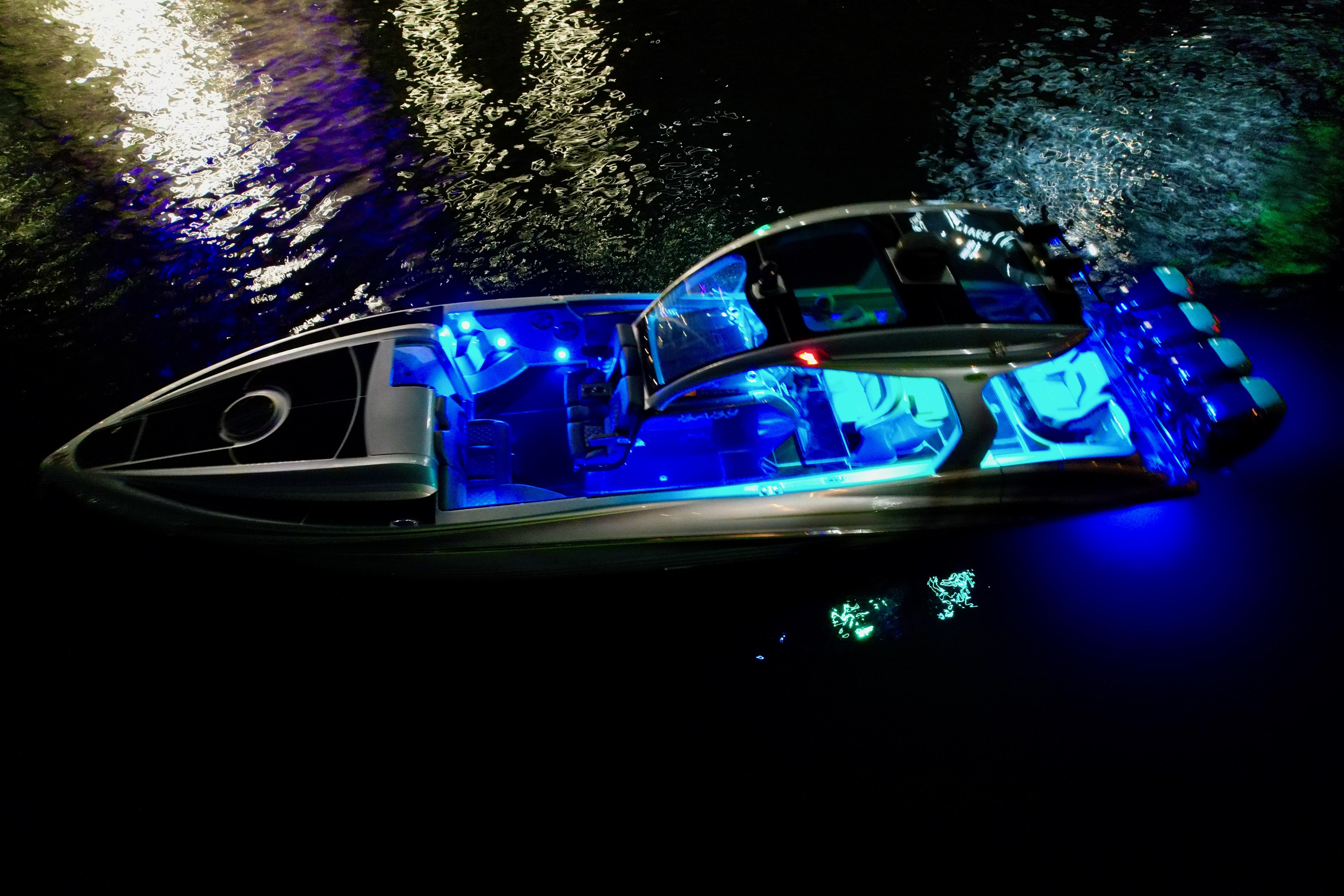 LED deck lighting below the gunwales, and blue spot courtesy lighting throughout.