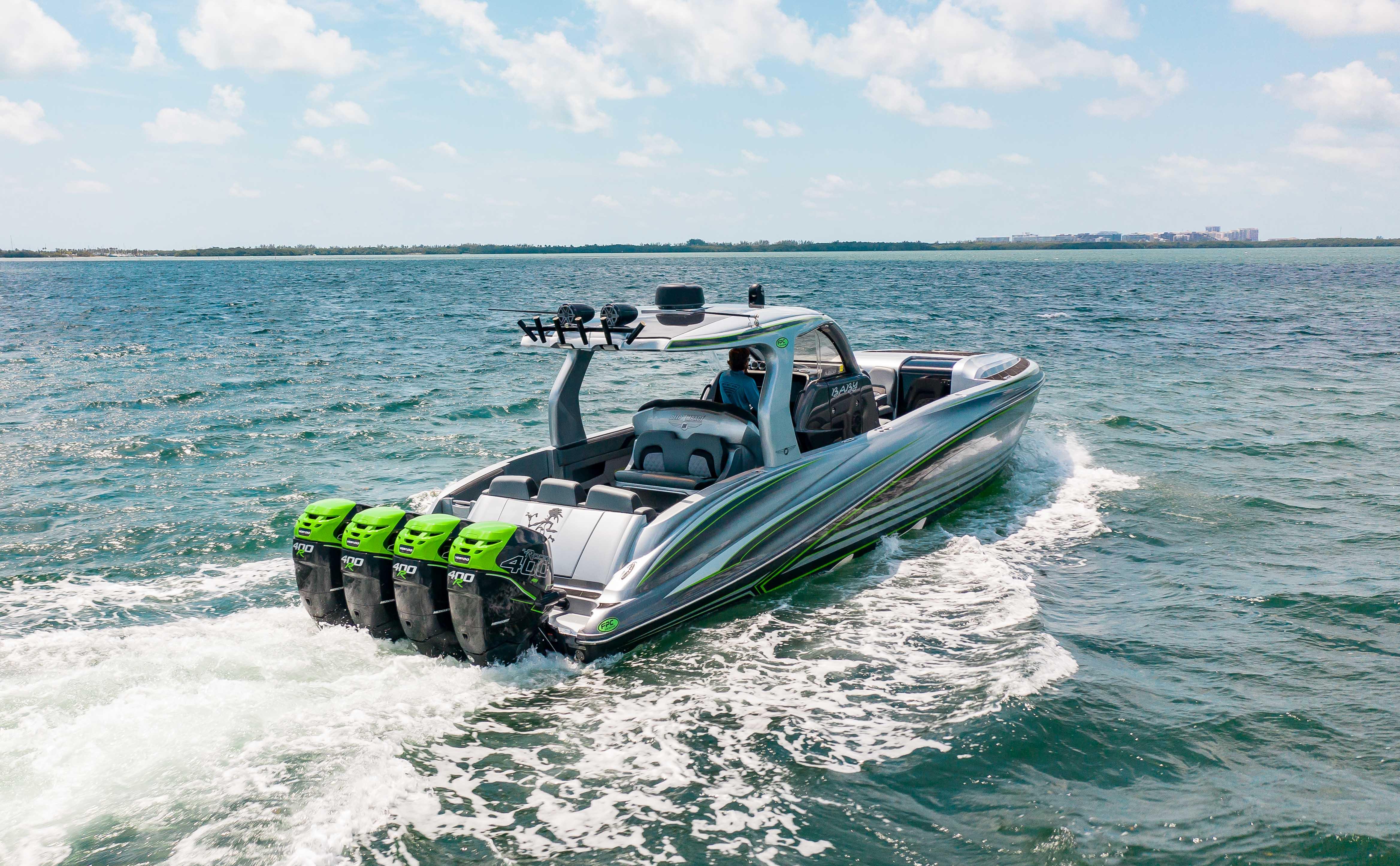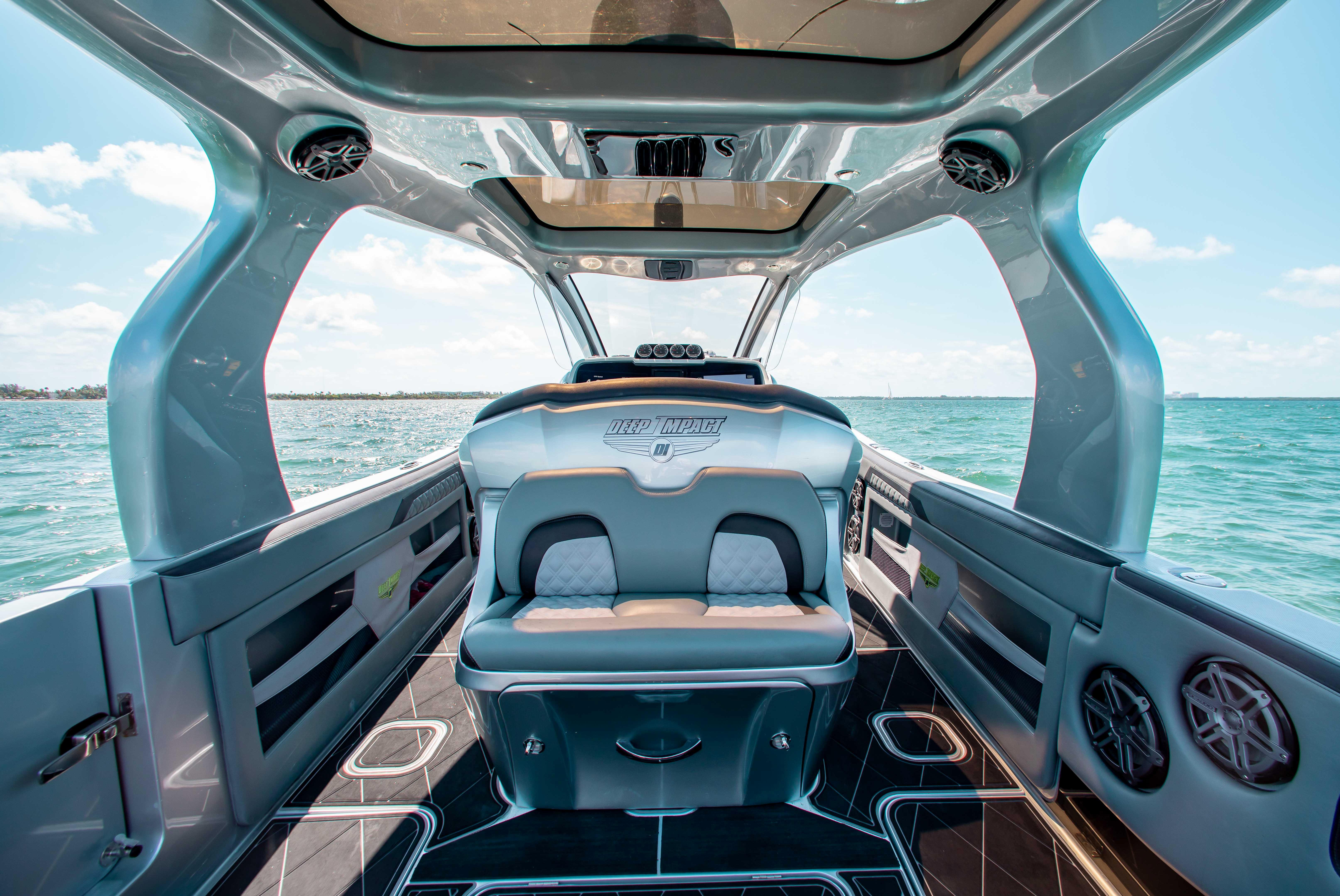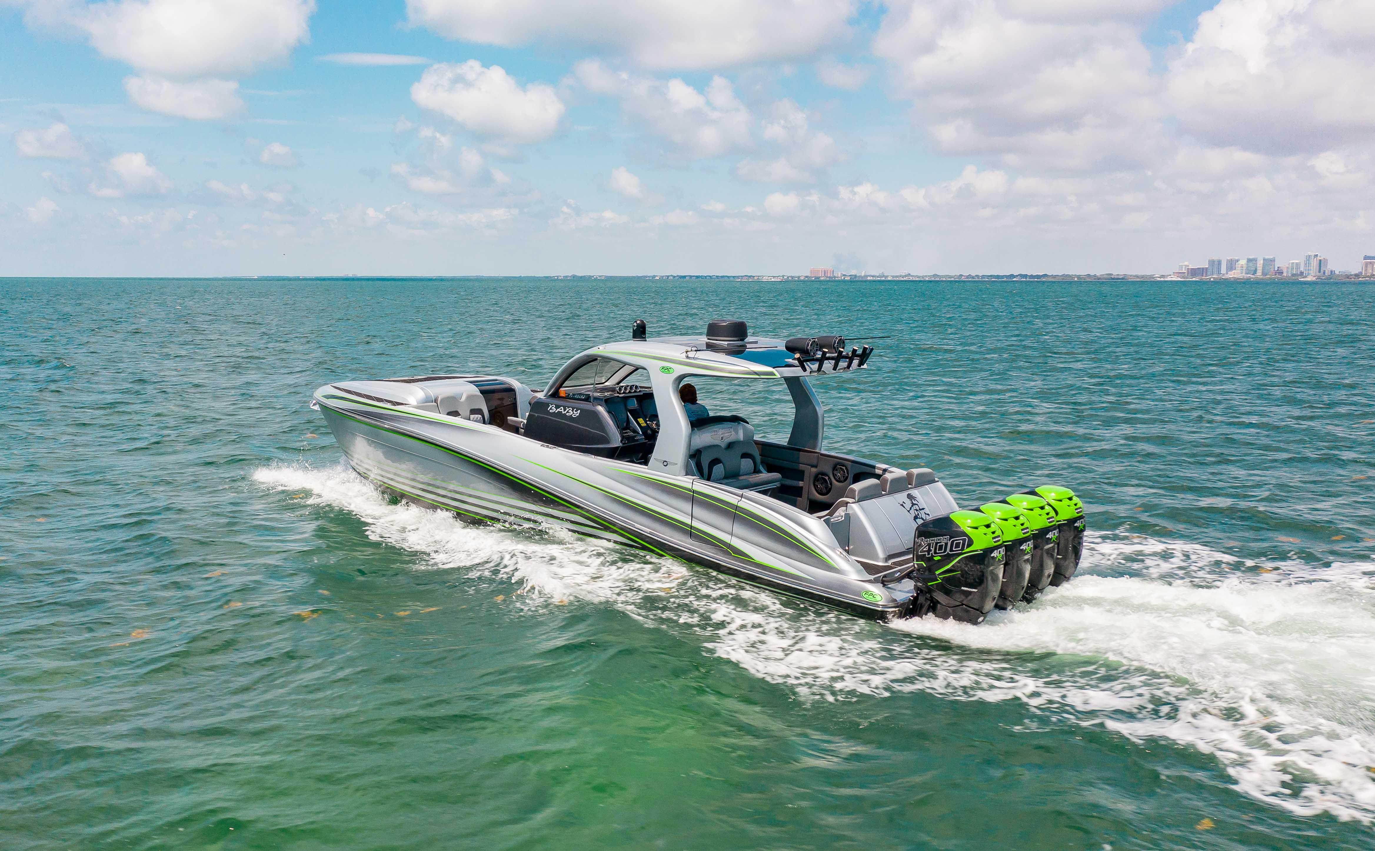 This 2018 Deep Impact 399 Cabin has a fiberglass hull, quadruple outboard engine, single