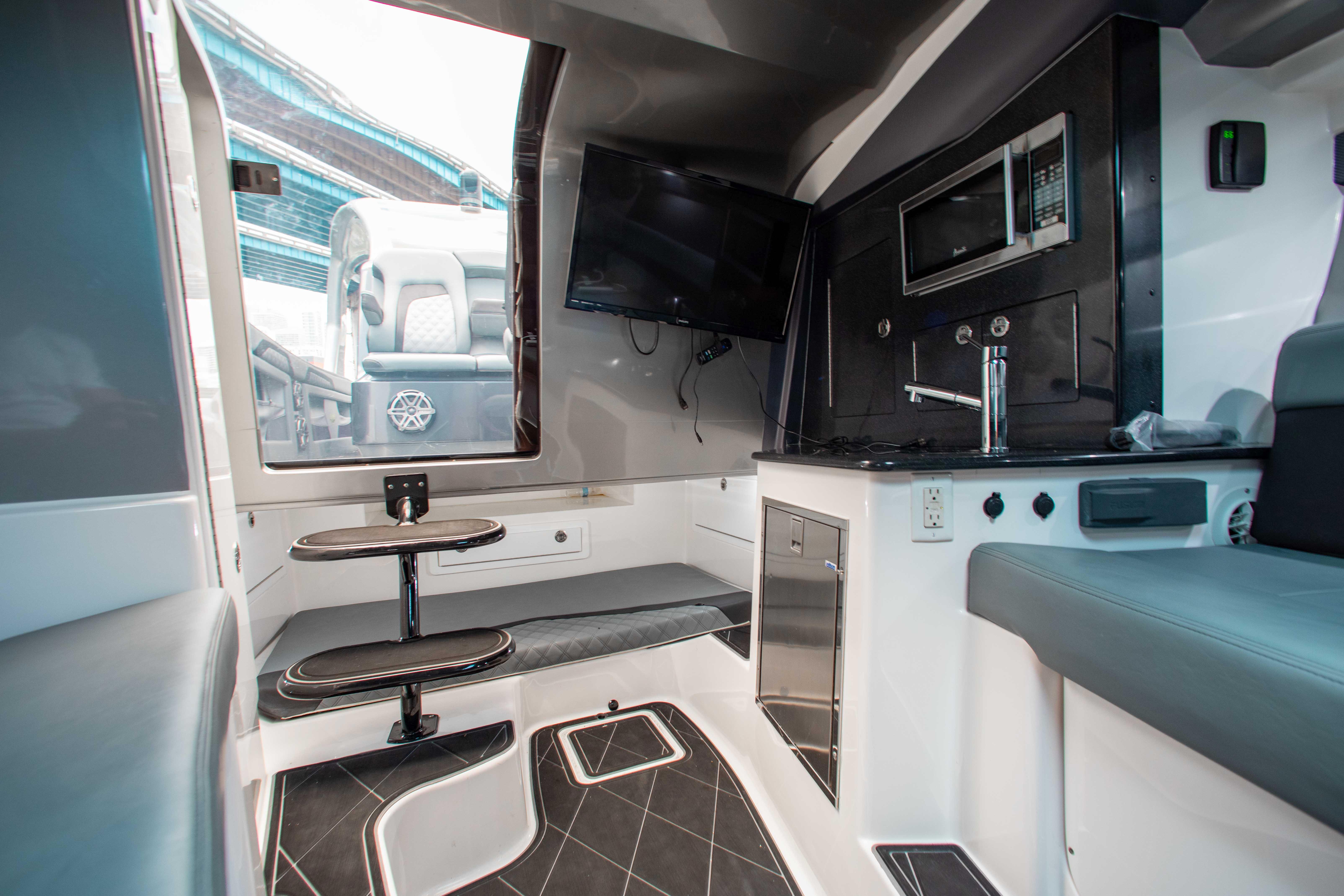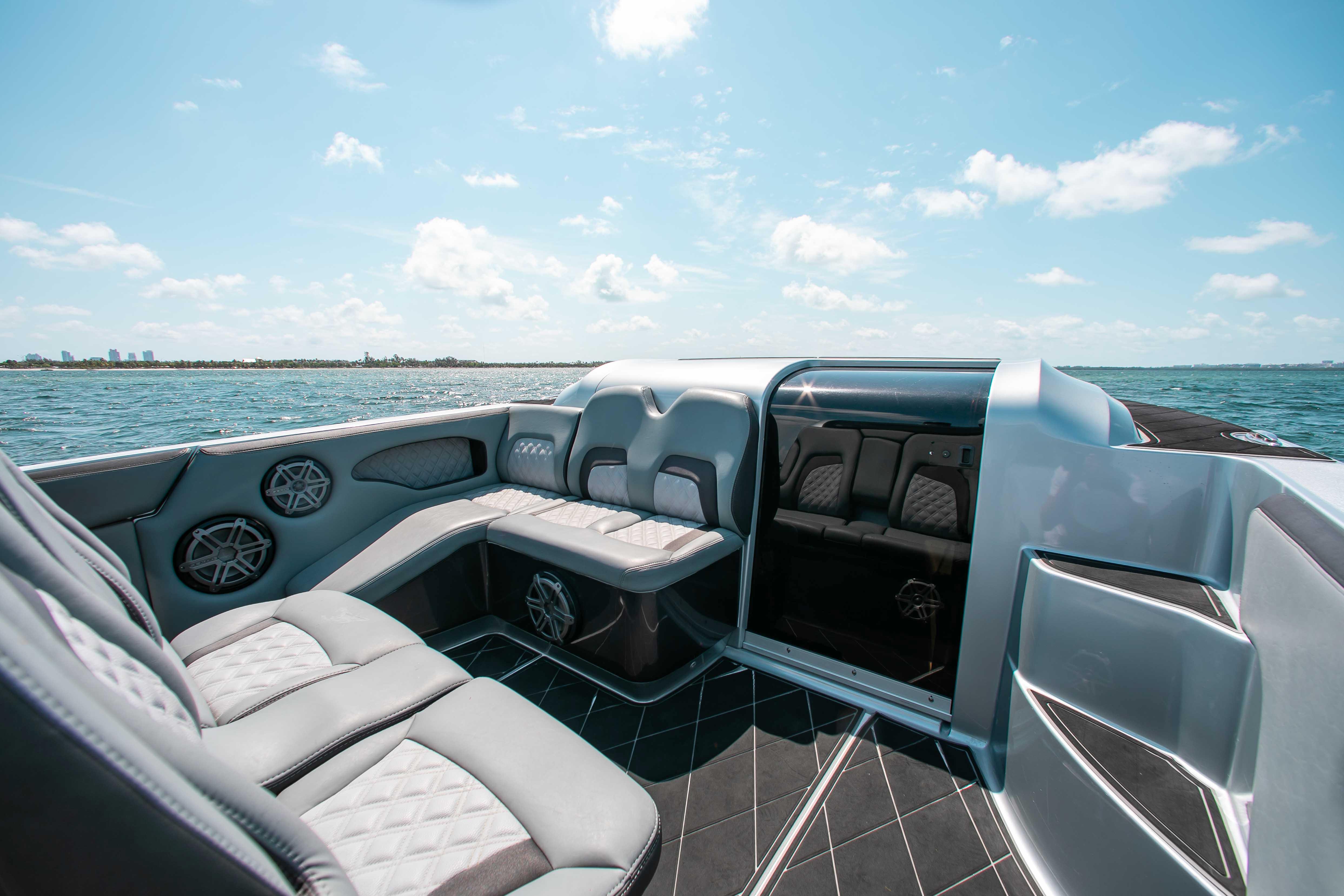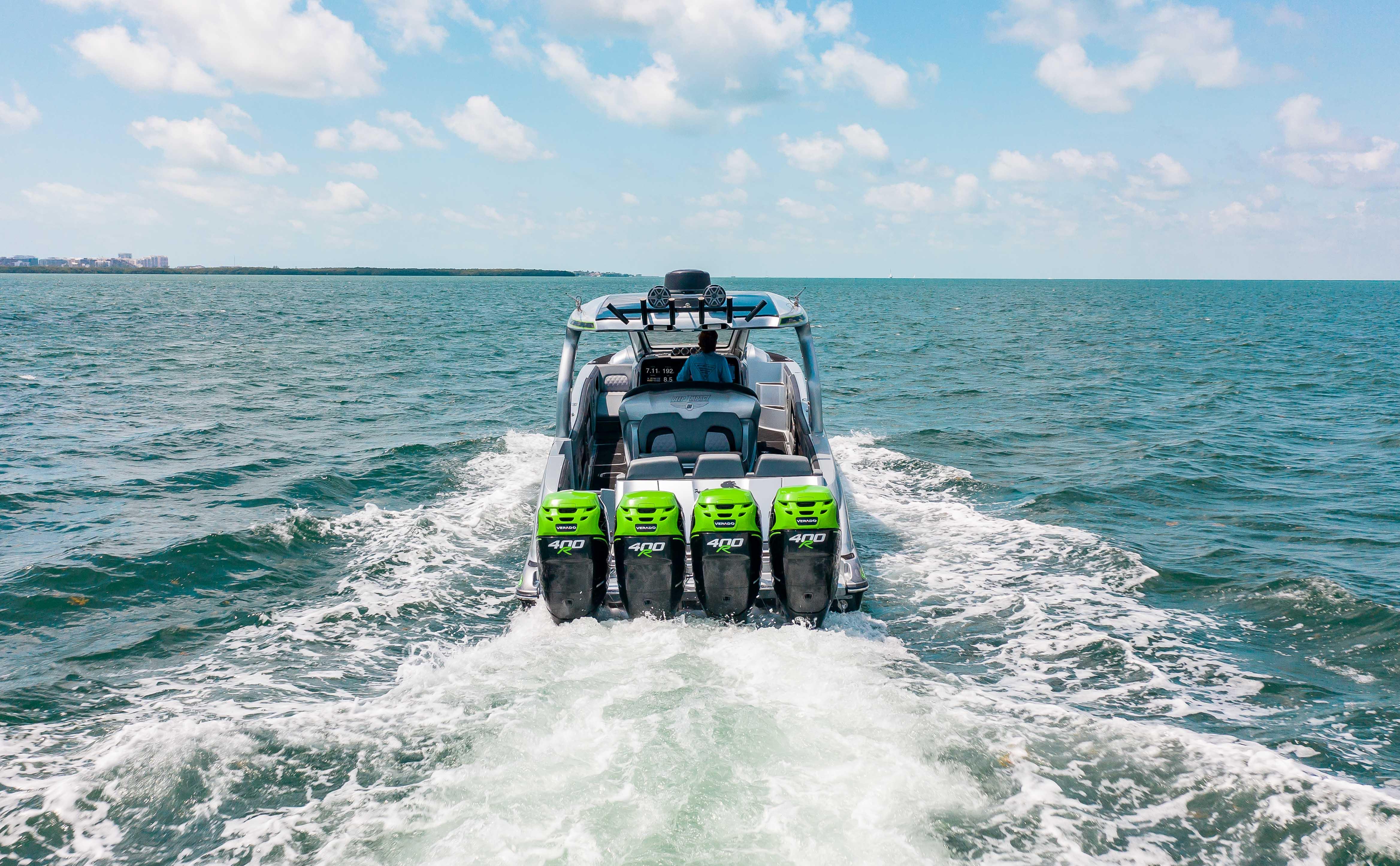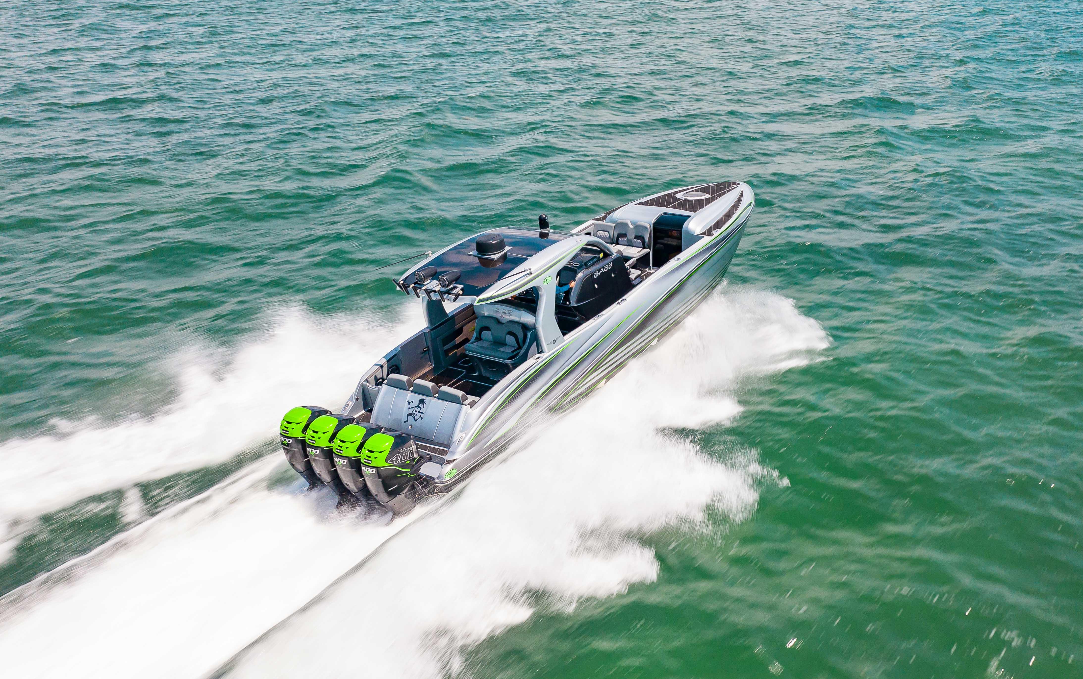 This 2018 Deep Impact 399 Cabin has a fiberglass hull, quadruple outboard engine, single