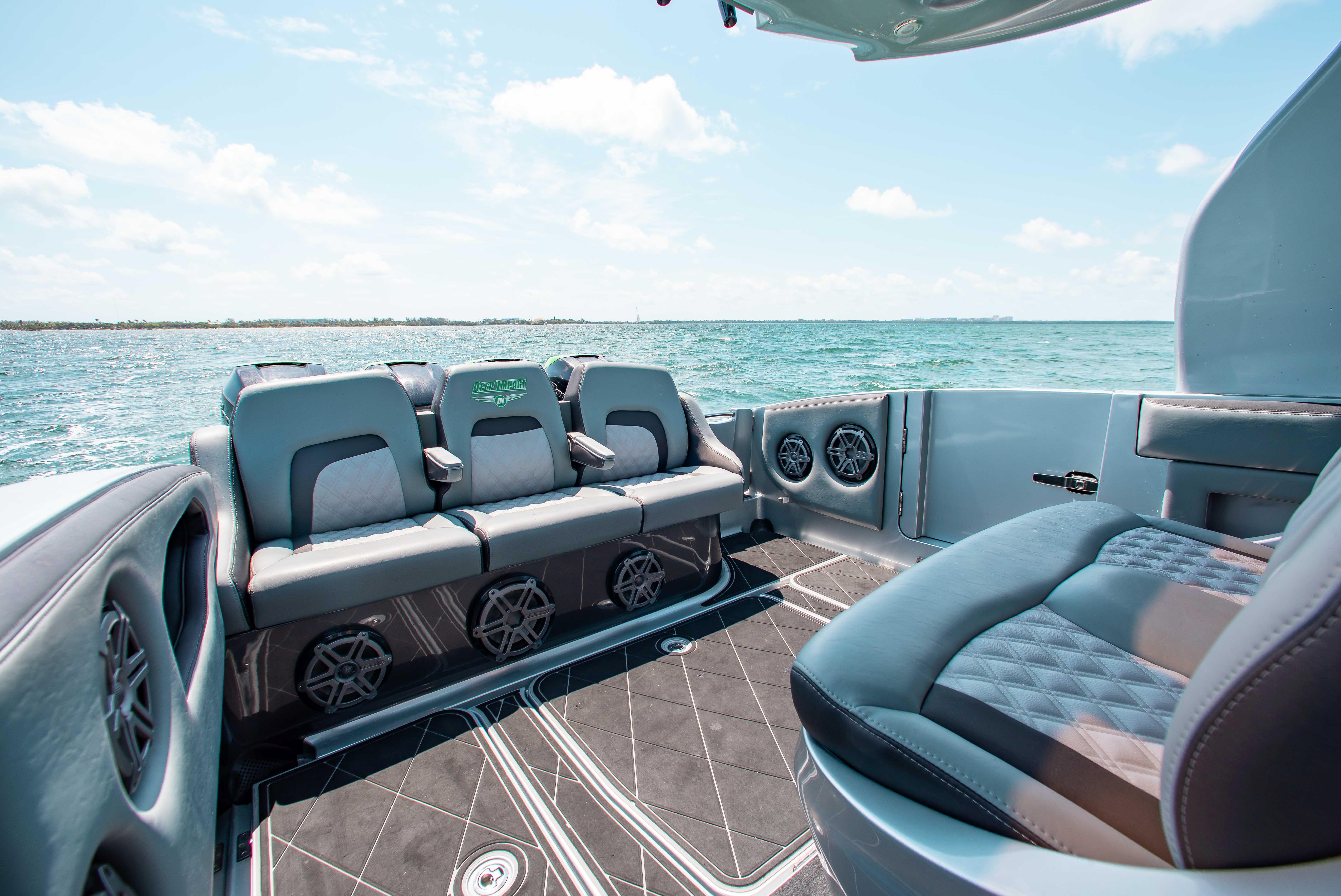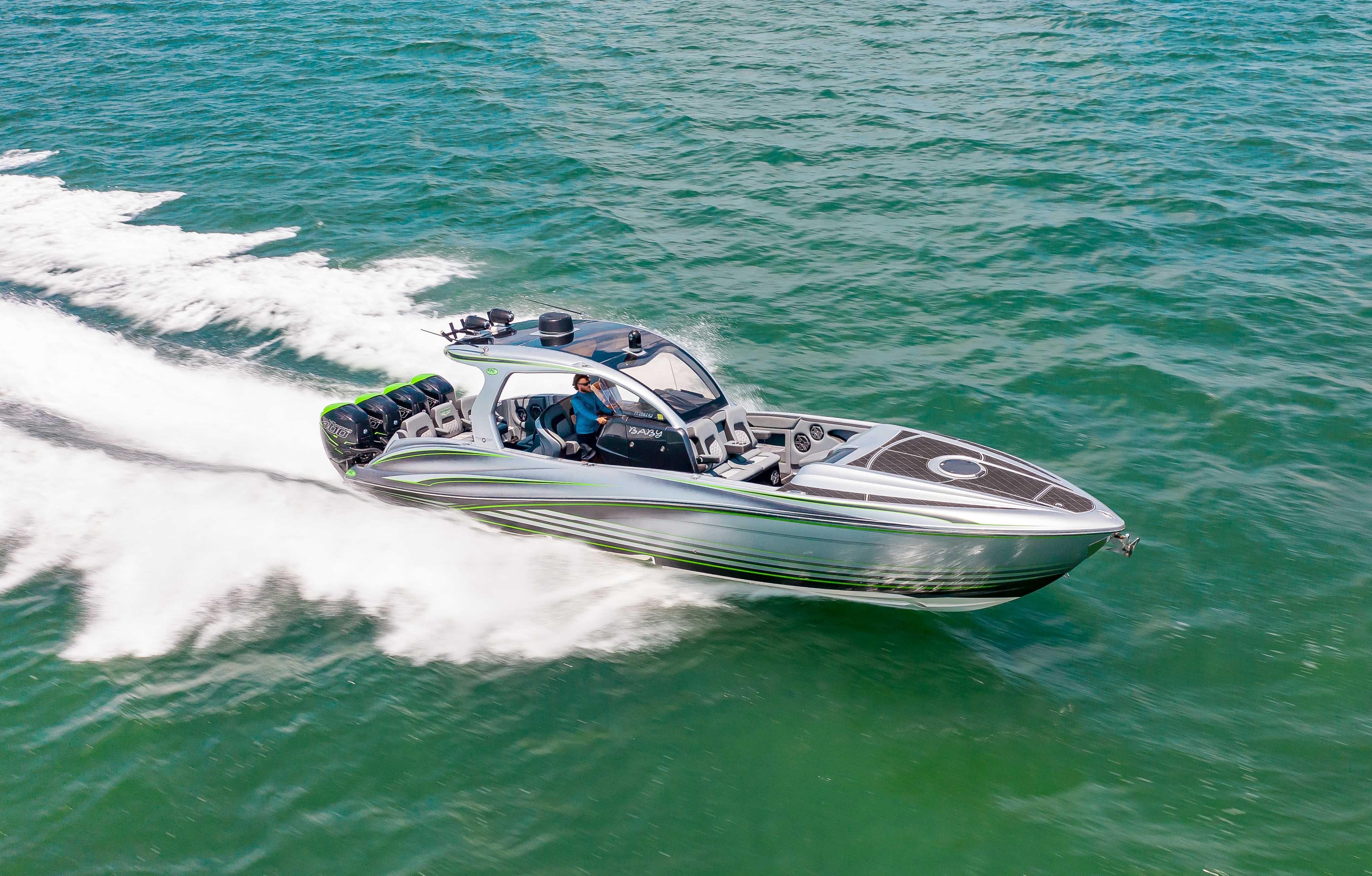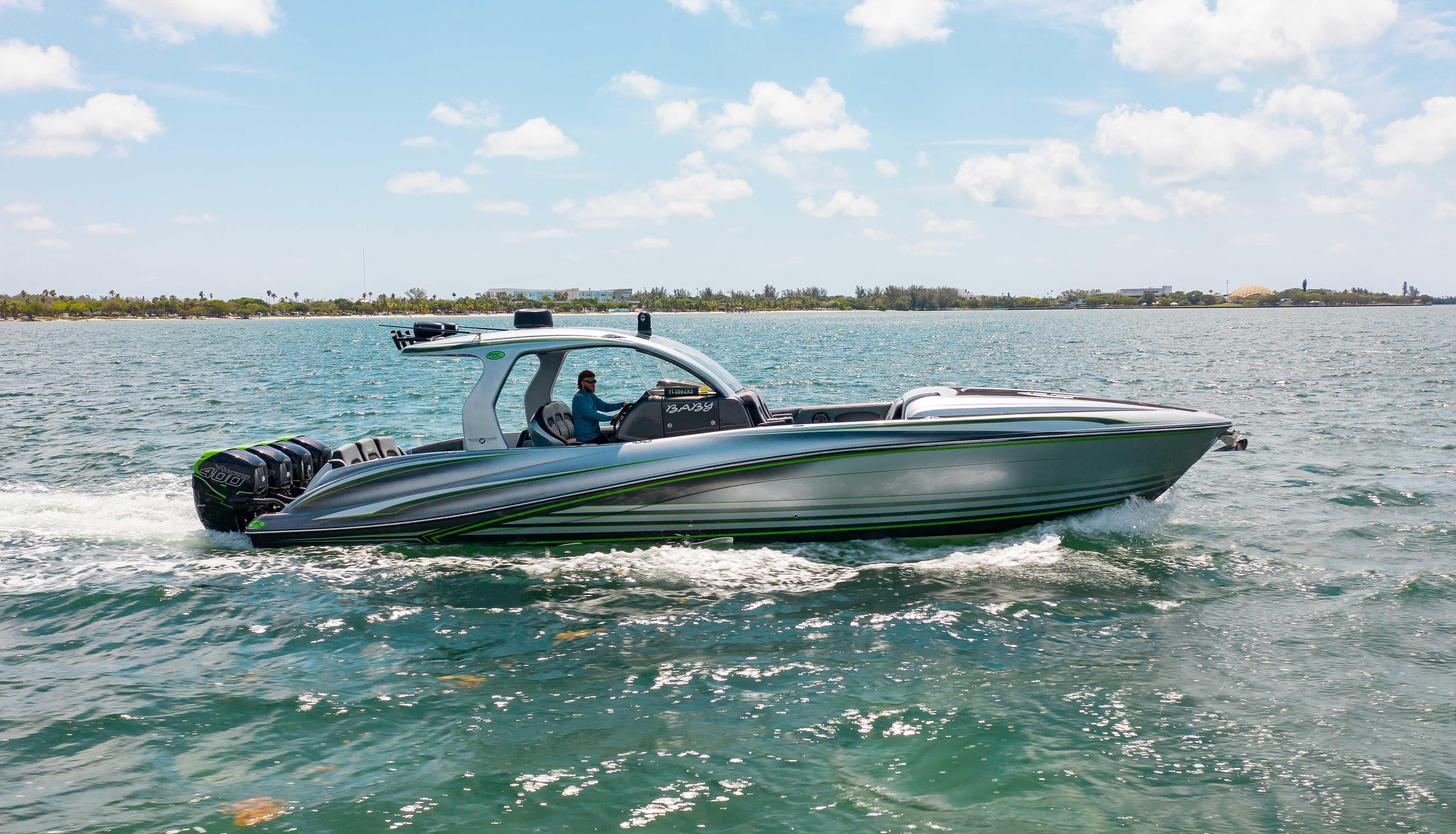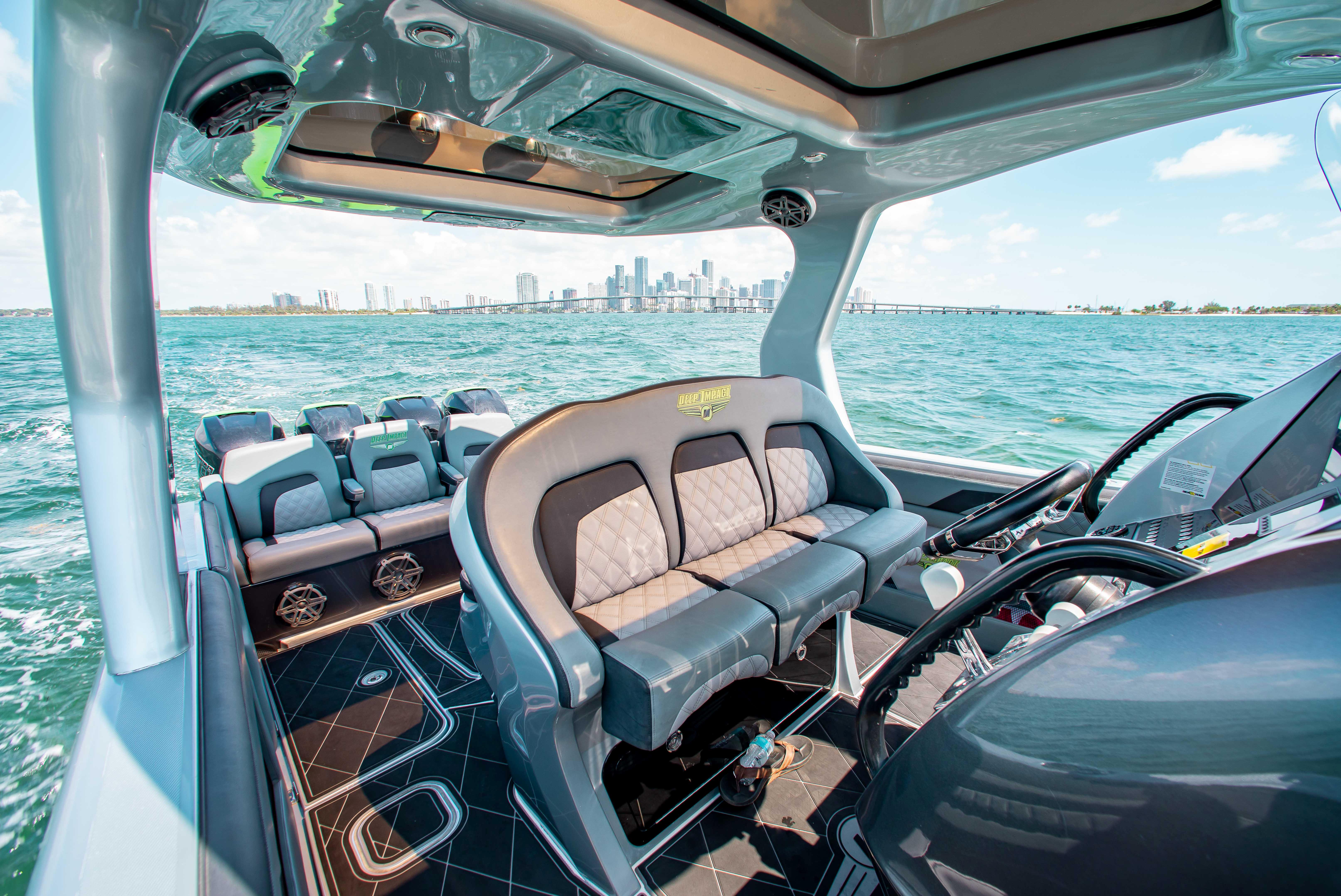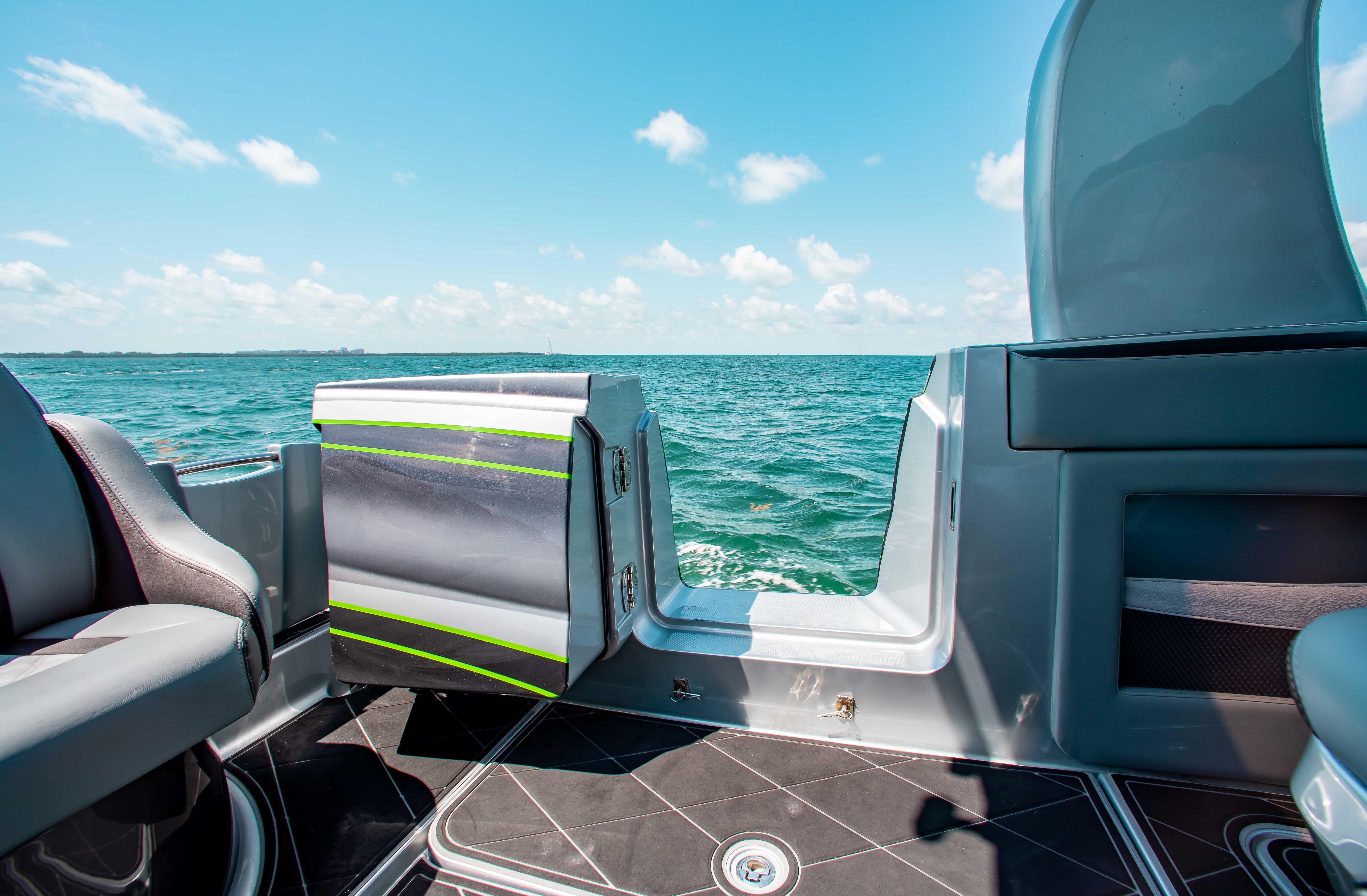 Forward in the cockpit is an open dash, with fixed acrylic wings, and the helm station, with center steering, full 'glass cockpit' dash navigation electronics, and quad engine controls, followed by a modular helm bench/triple seat convertible leaning post, with fold-down armrests, molded footrests, a storage locker below, and aft bench seating with a hide-away deck cooler. Moving aft in the cockpit are outboard deck boxes, a center lazarette and bilge access hatch, and a port hinged dive door, followed by an enclosed transom, with a starboard triple bench seat module, and a port door to a molded splash-well, with an aft transom locker. The hull and transom are silver paint over graphite gel coat, with green and black graphics, molded accent rails, and white gel coat below the waterline, with matching green/black outboard engine covers.