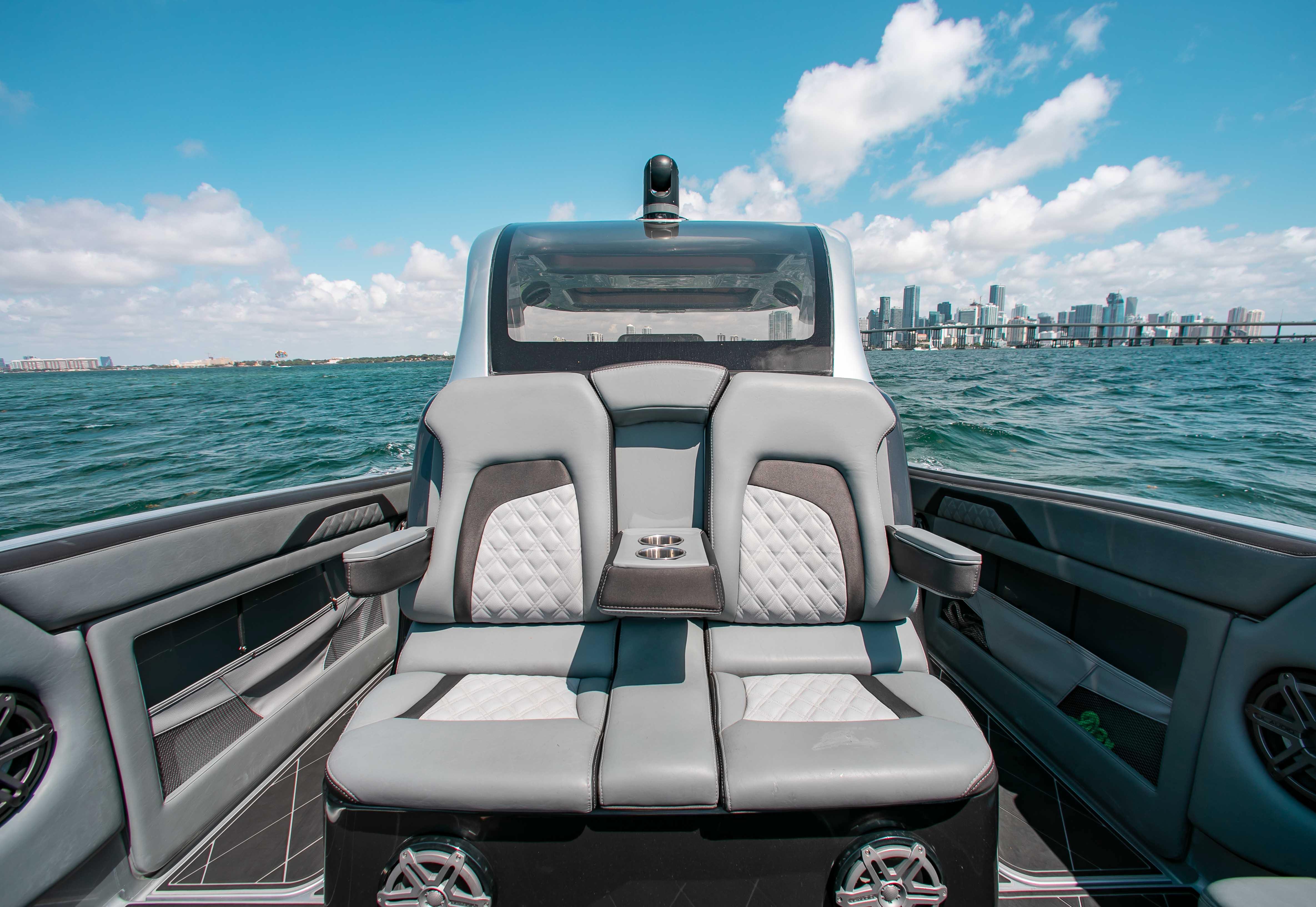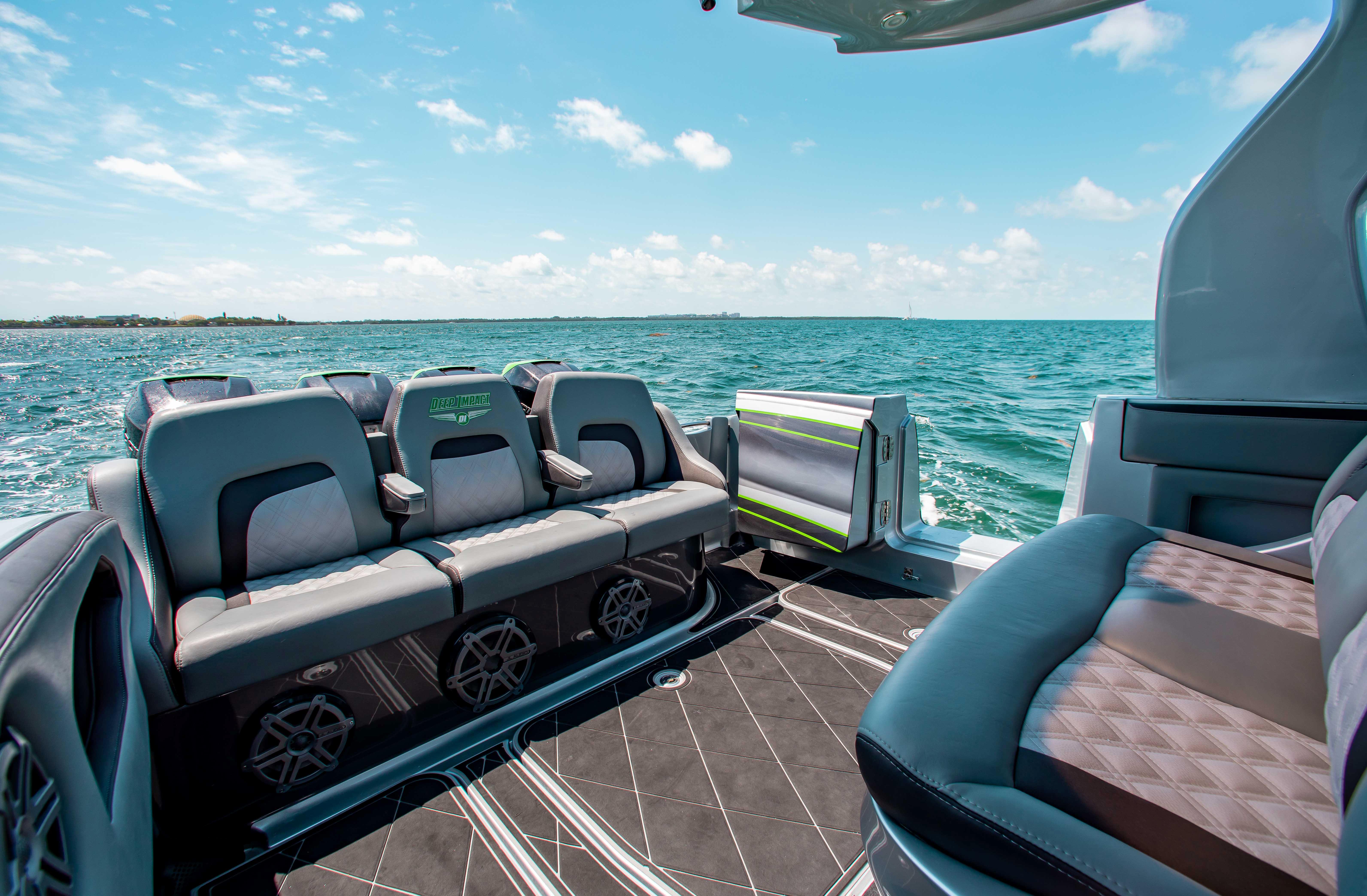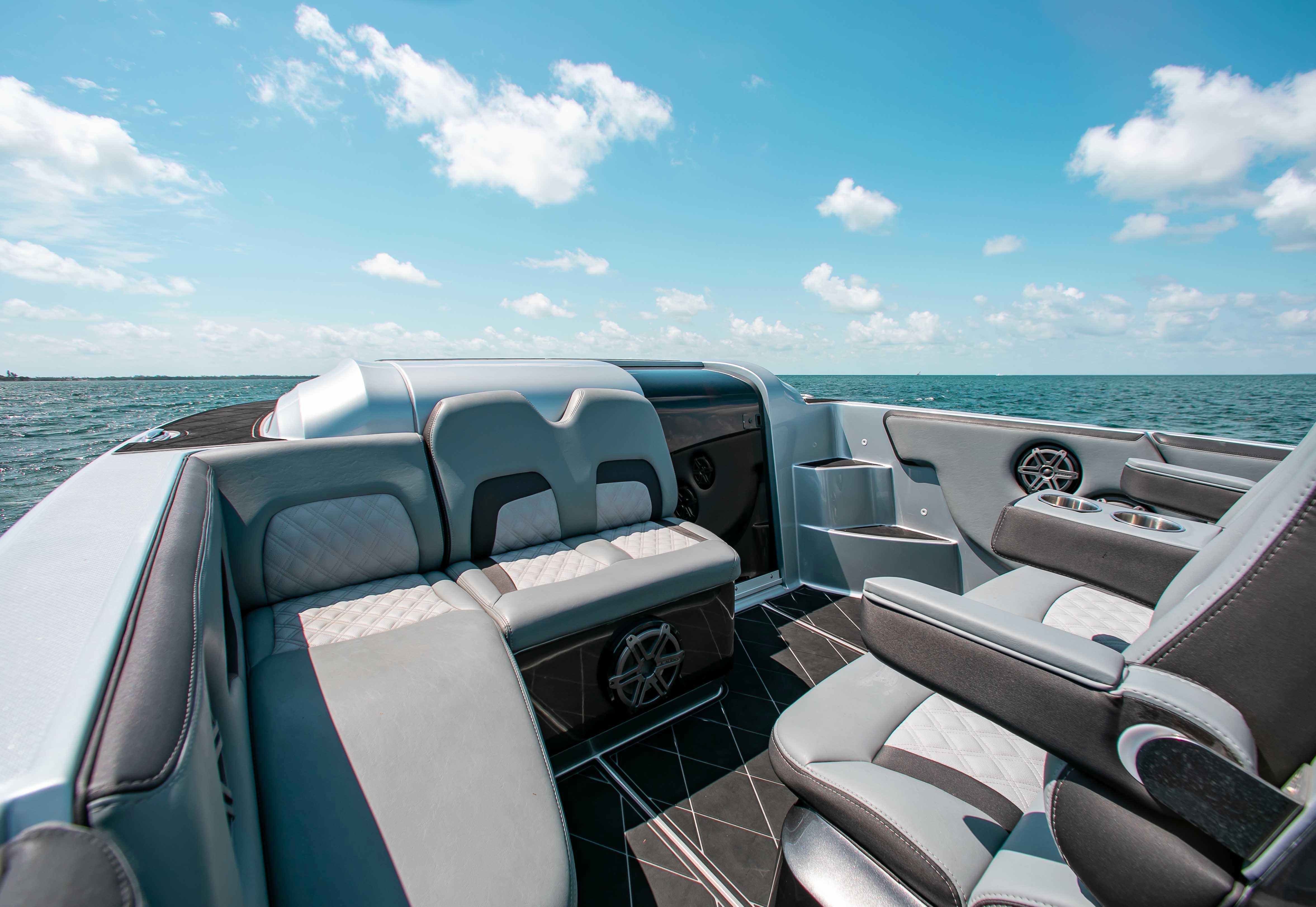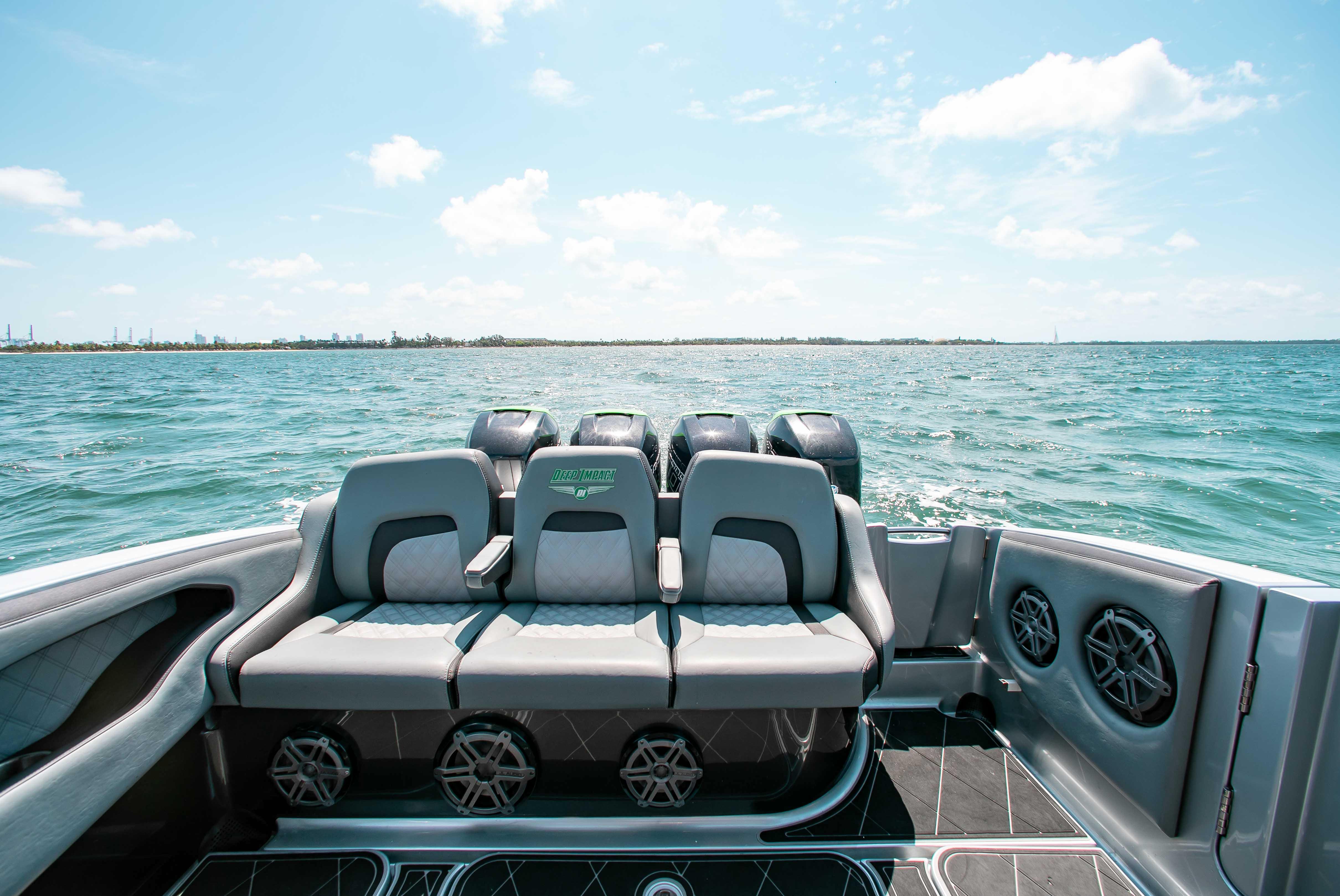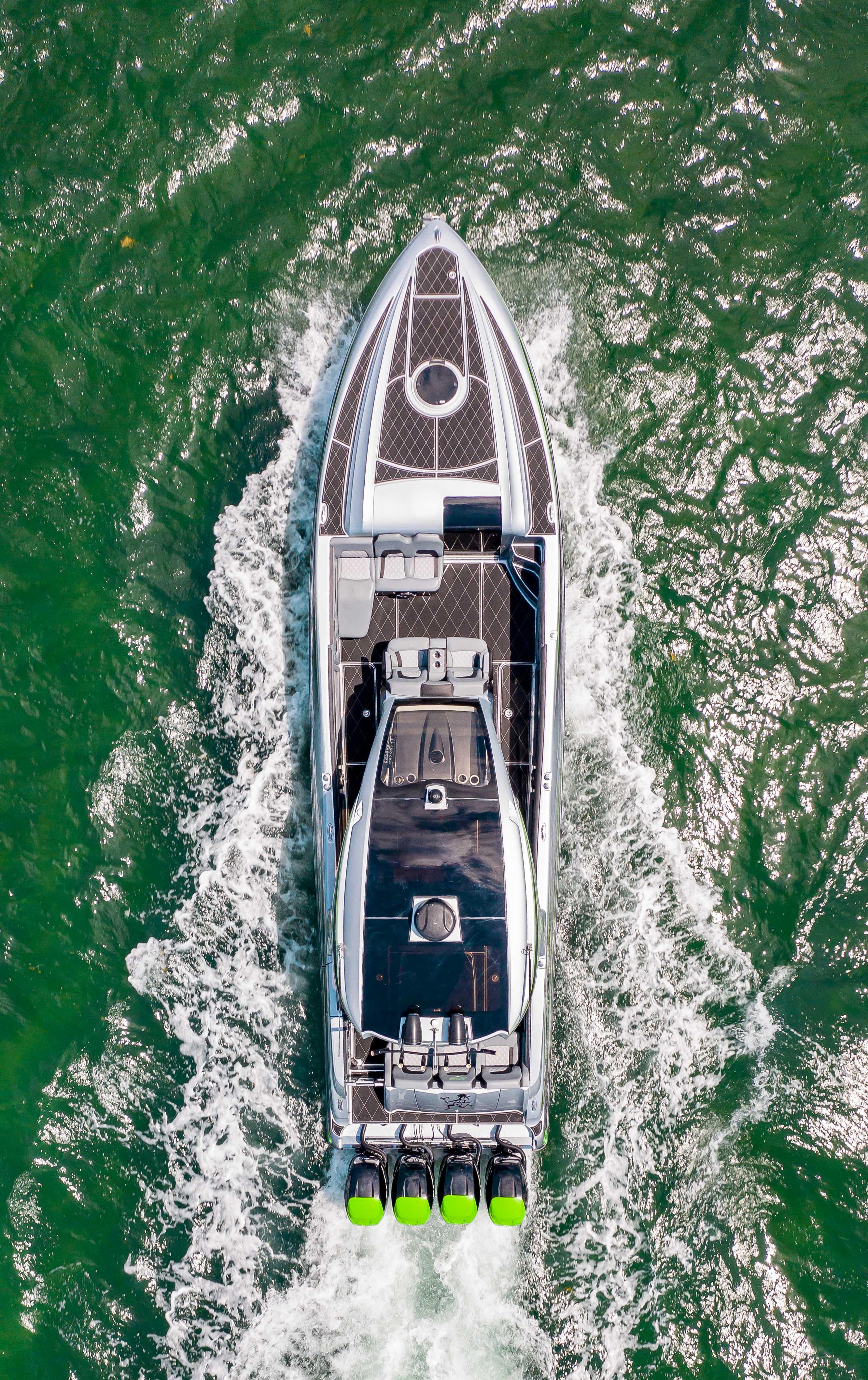 Forward in the cockpit is an open dash, with fixed acrylic wings, and the helm station, with center steering, full 'glass cockpit' dash navigation electronics, and quad engine controls, followed by a modular helm bench/triple seat convertible leaning post, with fold-down armrests, molded footrests, a storage locker below, and aft bench seating with a hide-away deck cooler. Moving aft in the cockpit are outboard deck boxes, a center lazarette and bilge access hatch, and a port hinged dive door, followed by an enclosed transom, with a starboard triple bench seat module, and a port door to a molded splash-well, with an aft transom locker. The hull and transom are silver paint over graphite gel coat, with green and black graphics, molded accent rails, and white gel coat below the waterline, with matching green/black outboard engine covers.