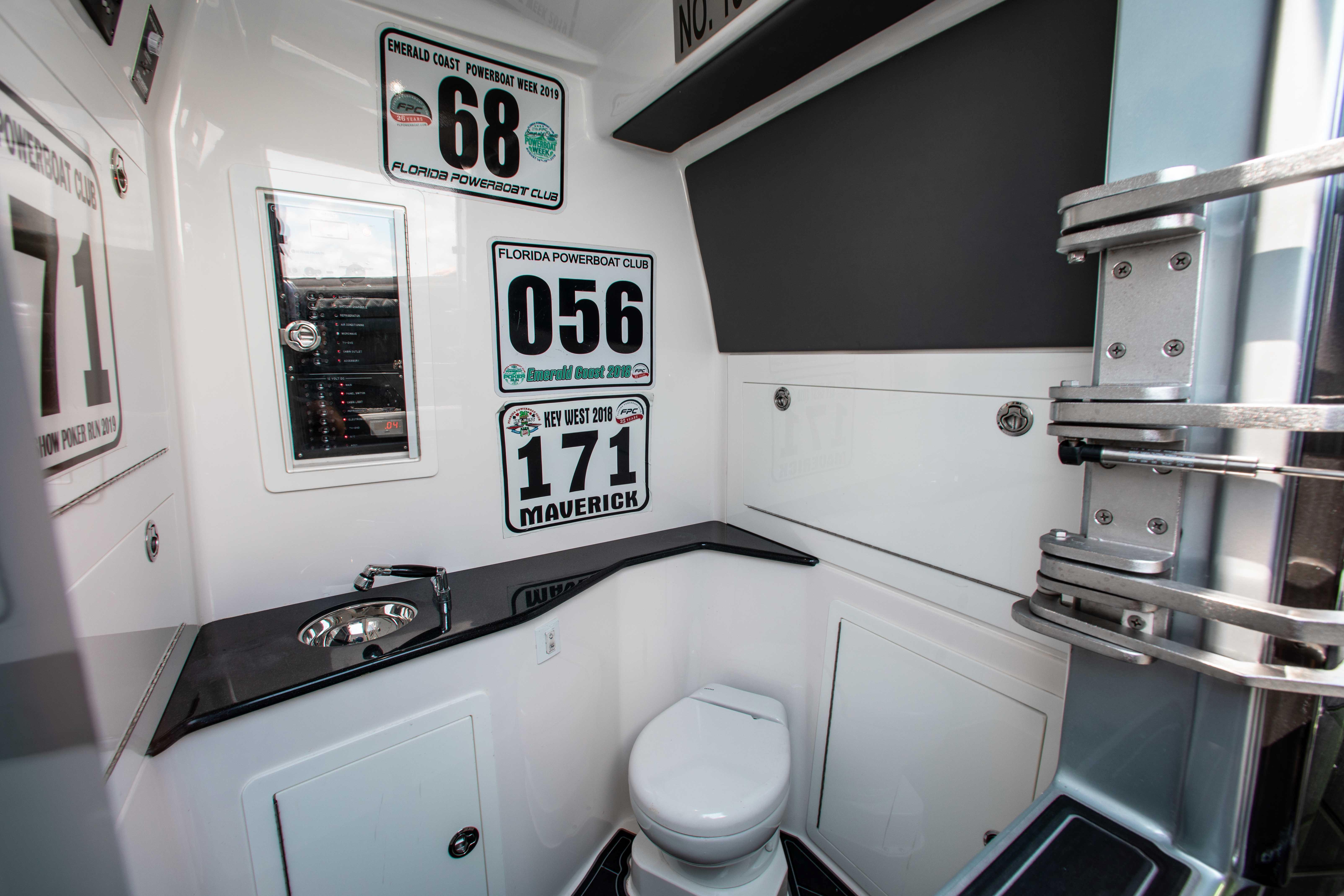 battery access locker, and a porcelain marine head, with a Corian counter/stainless sink vanity,