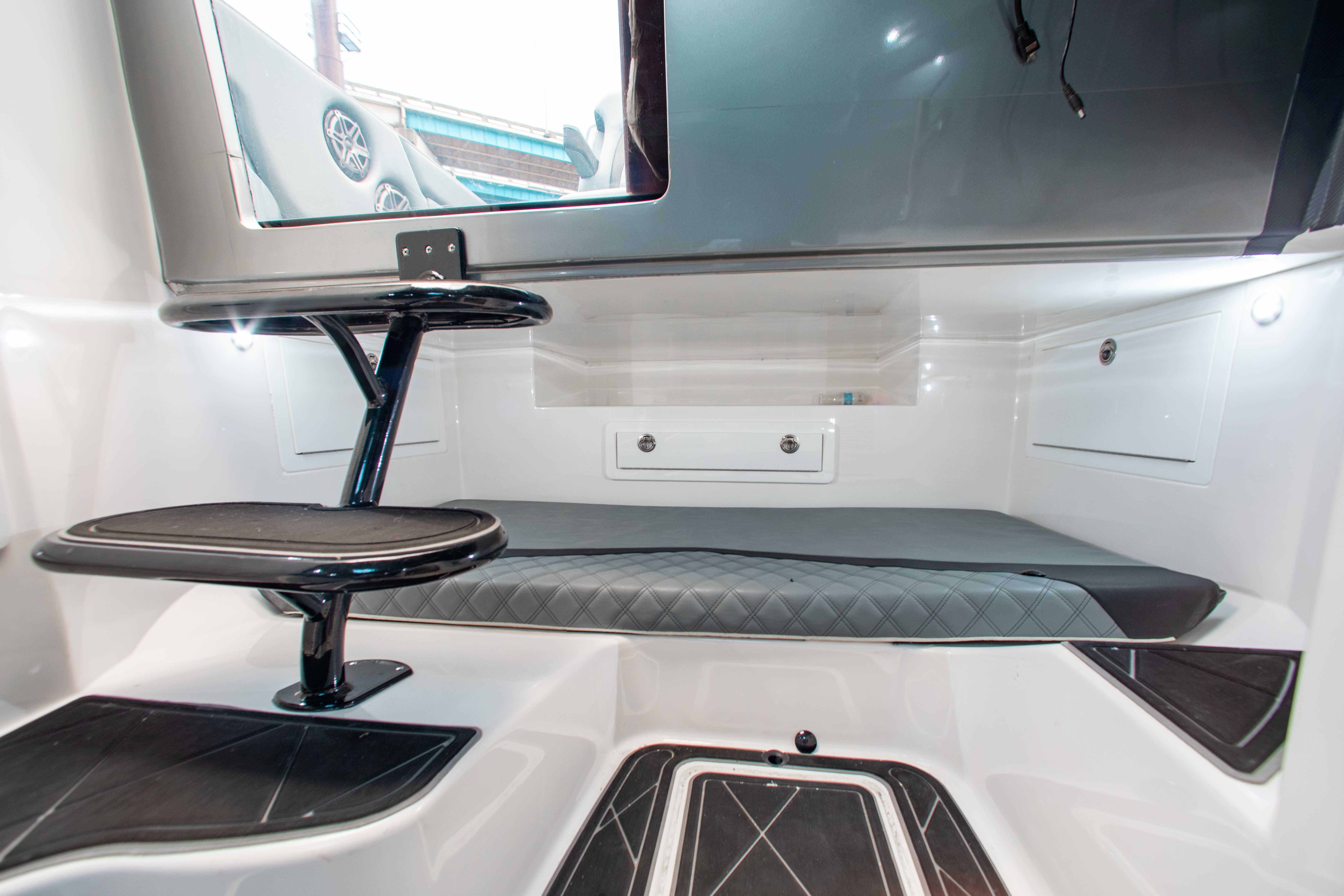 access. Forward is a cuddy cabin with an anchor locker access hatch and two speakers forward,