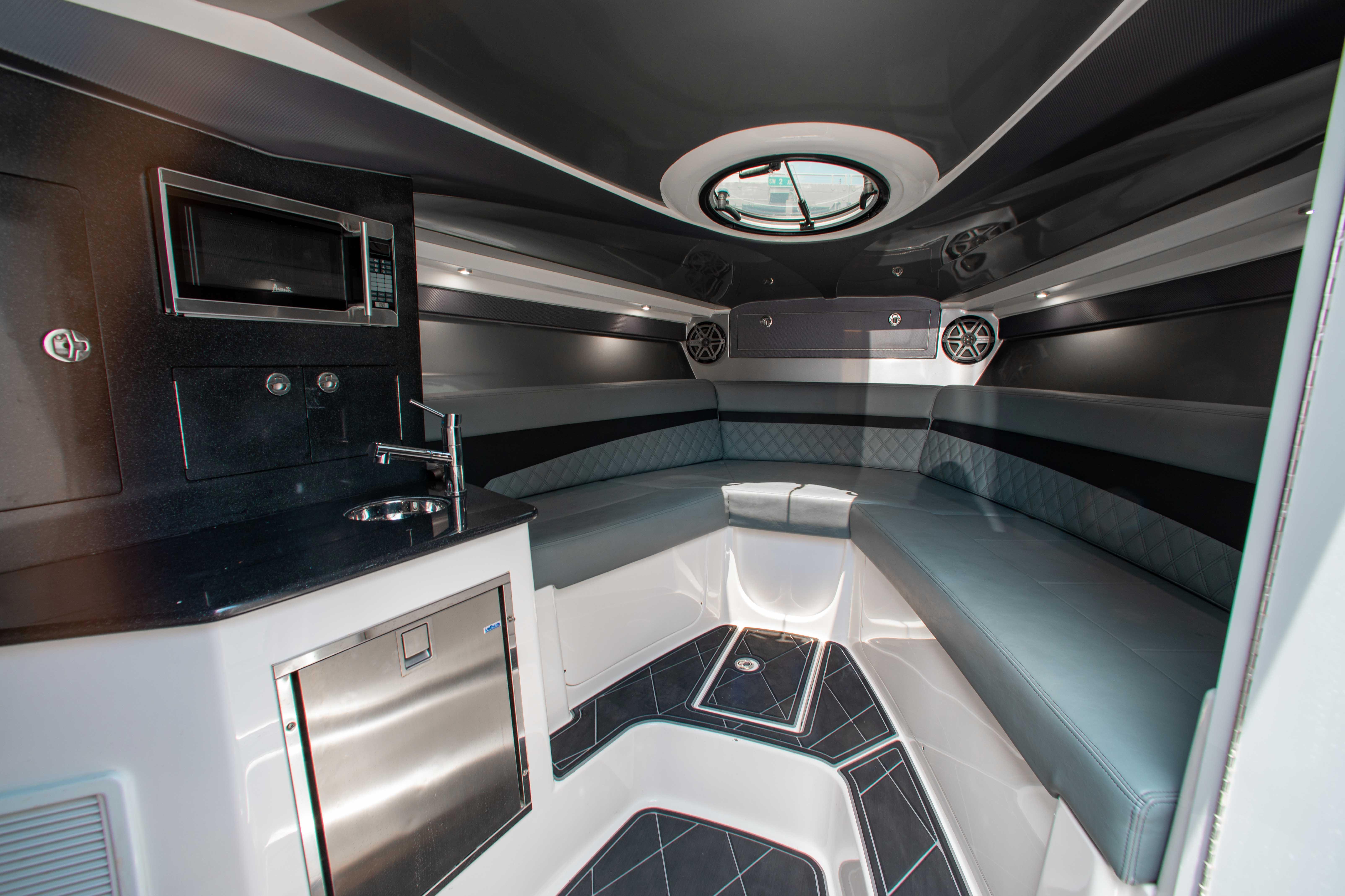 followed by a wrap-around bench seat module. Moving aft in the cuddy, and down one step to
