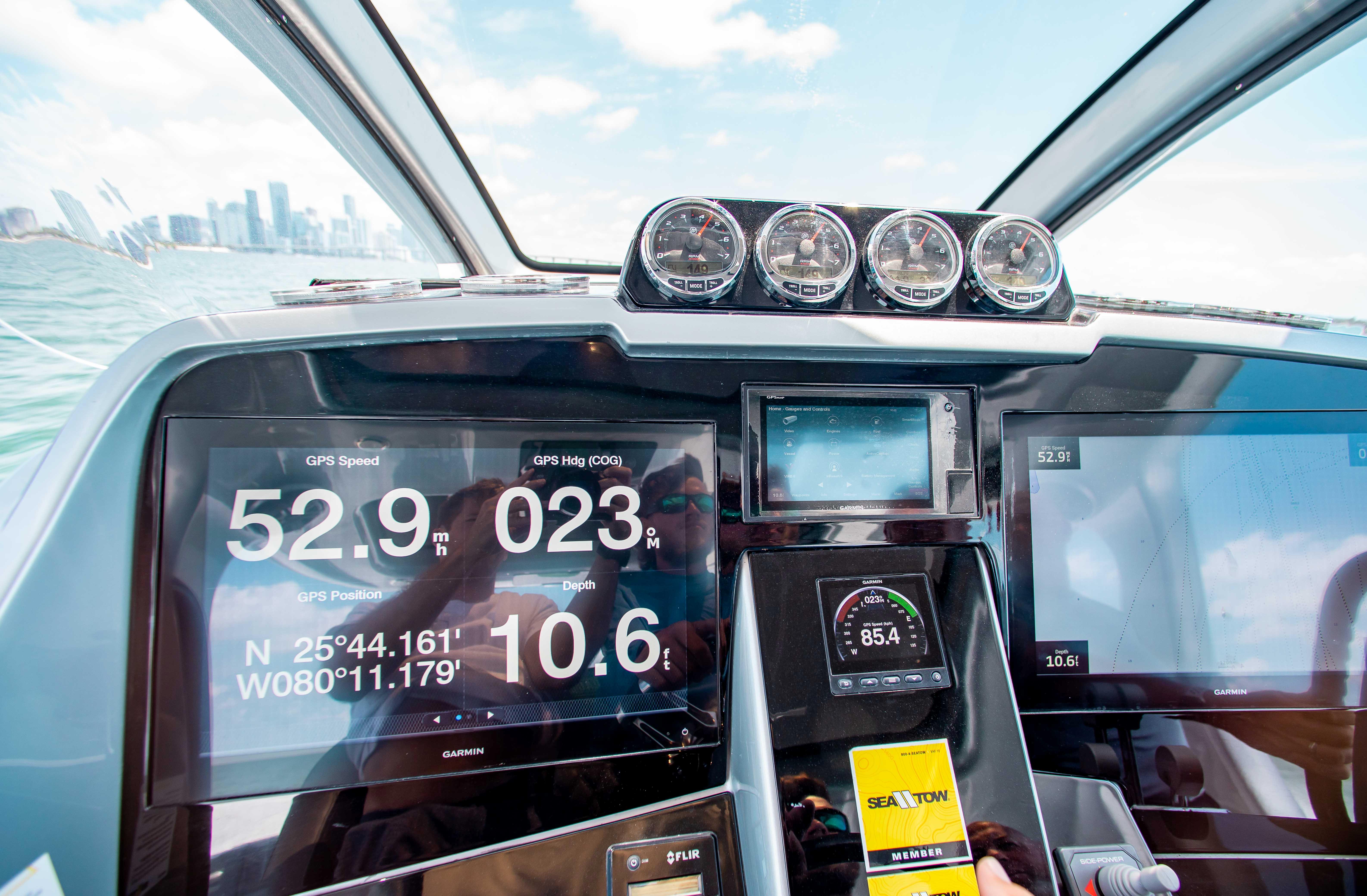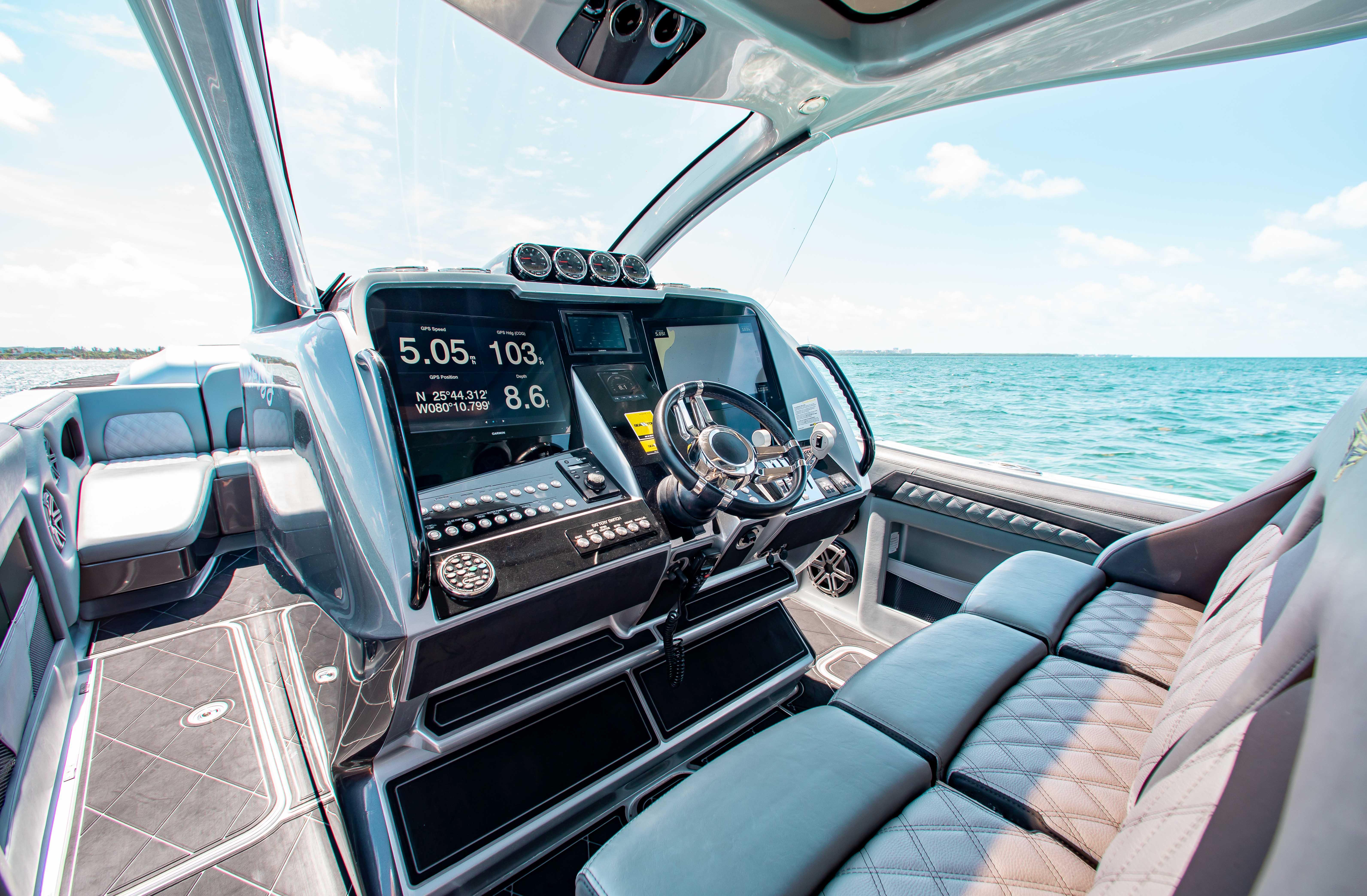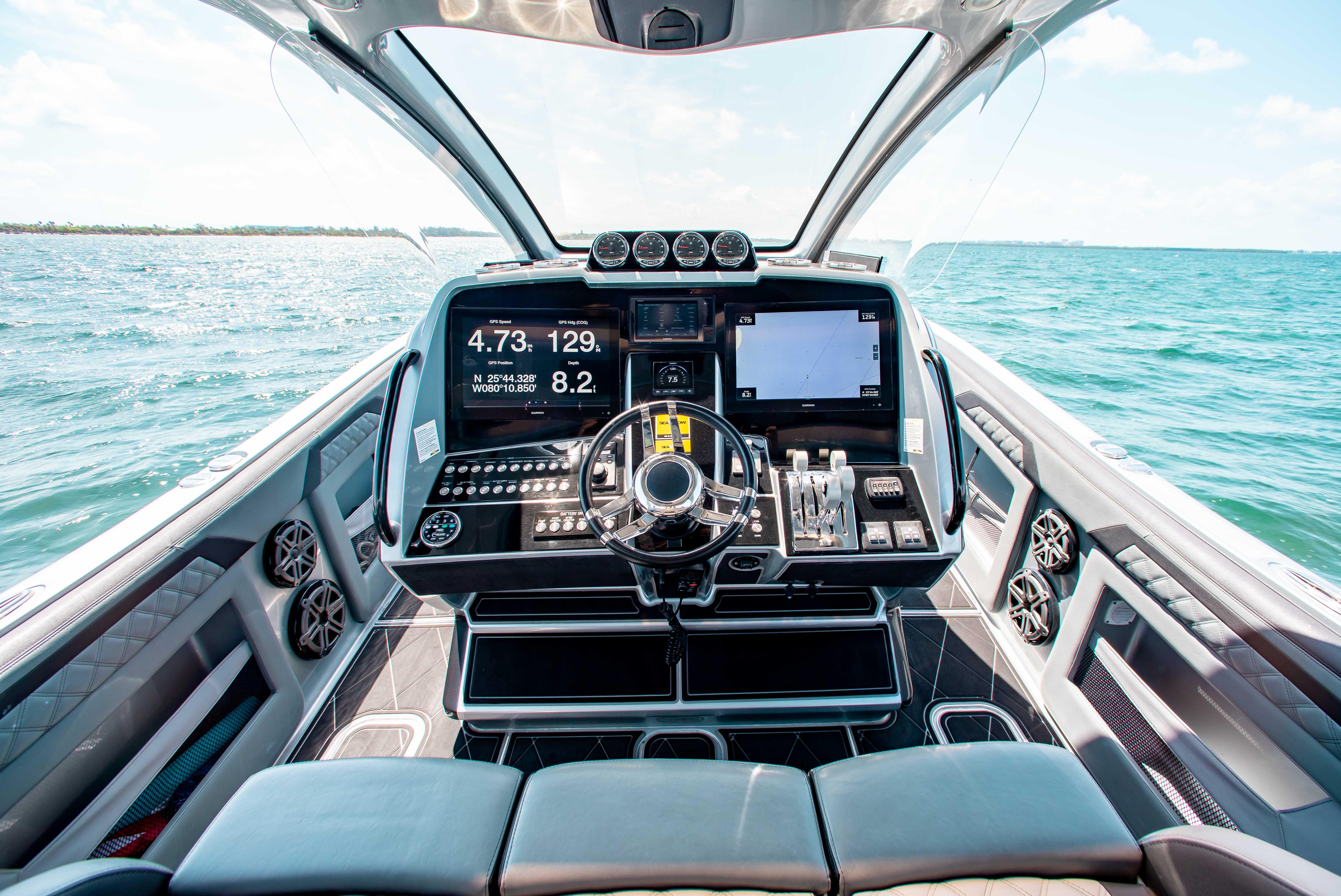 - Helm Additional: FLIR camera control/display pad, Side-Power bow thruster joystick control panel, OutBack inverter power control/digital display panel, Four-button trim tab control panel.