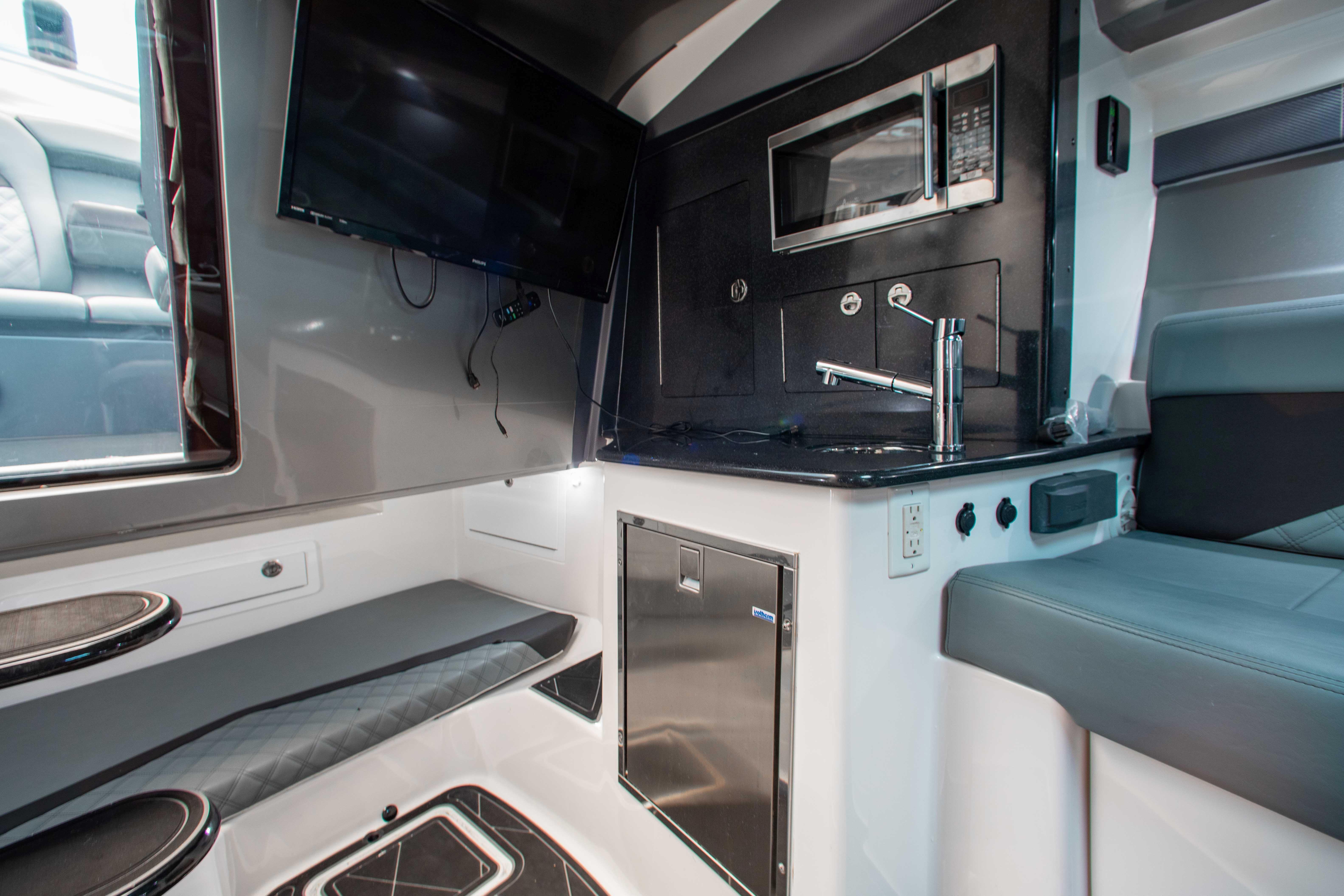 port is a galley module, with a black Corian counter and backsplash cabinetry, a stainless sink,